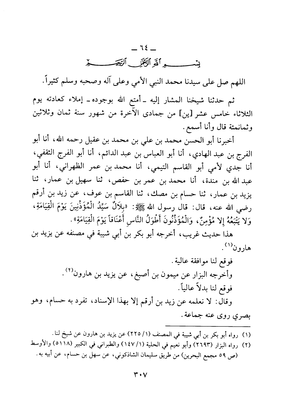 أخبرنا أبو الحسن محمد بن علي بن محمد بن عقيل رحمه الله، أنا أبو الفرج بن عبد الهادي، أنا أبو العباس بن عبد الدائم، أنا أبو الفرج الثقفي، أنا جدي لأمي أبو القاسم التيمي، أنا محمد بن عمر الظهراني، أنا أبو عبد الله بن مندة، أنا محمد بن عمر بن حفص، ثنا سهيل بن عمار، ثنا يزيد بن عمار، ثنا حسام بن مصك، ثنا القاسم بن عوف، عن زيد بن أرقم رضي الله عنه، قال: قال رسول الله صلى الله عليه وسلم: ((بلالٌ سيد المؤذنين يوم القيامة، ولا يتبعه إلا مؤمنٌ، والمؤذنون أطول الناس أعناقاً يوم القيامة)).