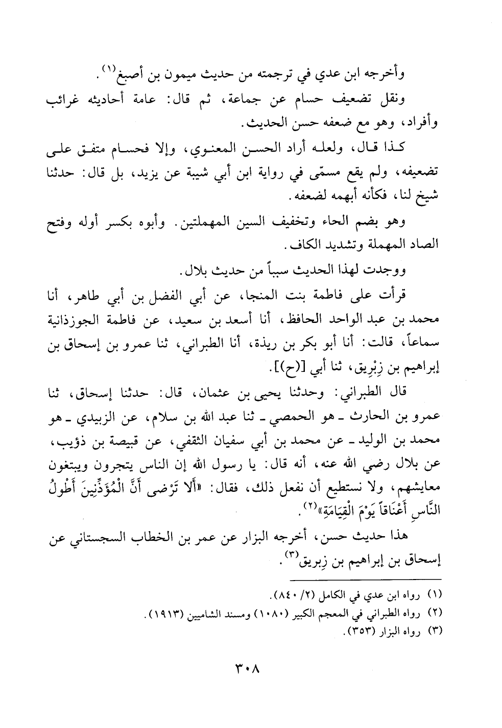 قال الطبراني: وحدثنا يحيى بن عثمان، قال: حدثنا إسحاق، ثنا عمرو بن الحارث -هو الحمصي- ثنا عبد الله بن سلام، عن الزبيدي -هو محمد بن الوليد- عن محمد بن أبي سفيان الثقفي، عن قبيصة بن ذؤيب، عن بلال رضي الله عنه، أنه قال: يا رسول الله إن الناس يتجرون ويبتغون معايشهم، ولا نستطيع أن نفعل ذلك، فقال: ((ألا ترضى أن المؤذنين أطول الناس أعناقاً يوم القيامة)).