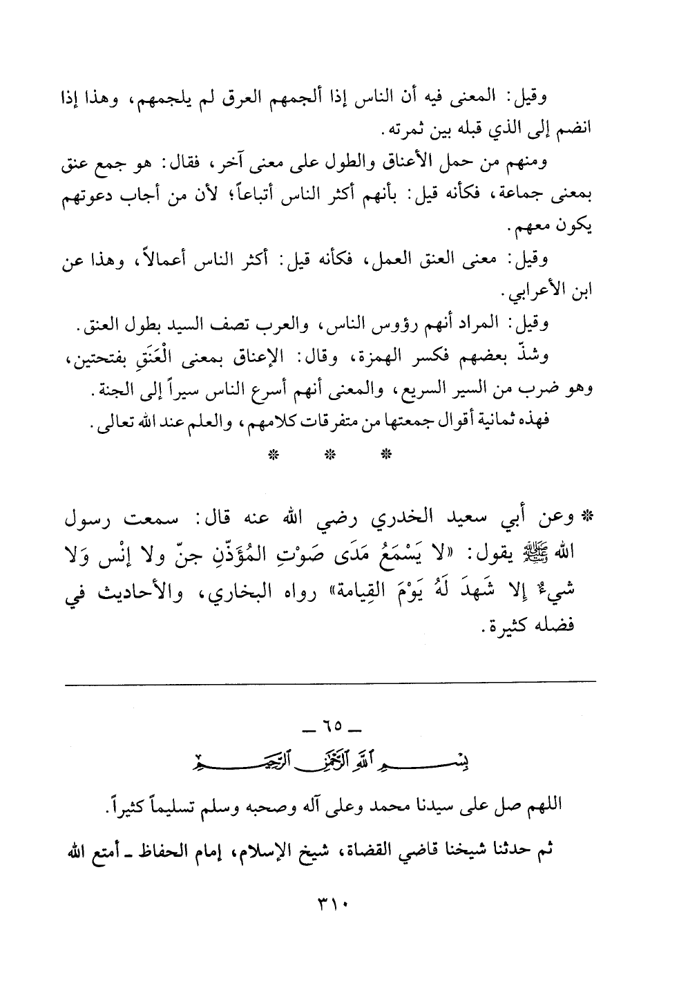 [[وعن أبي سعيد الخدري رضي الله عنه قال: سمعت رسول الله صلى الله عليه وسلم يقول: ((لا يسمع مدى صوت المؤذن جن ولا إنس ولا شيءٌ إلا شهد له يوم القيامة)) رواه البخاري، والأحاديث في فضله كثيرة.]]