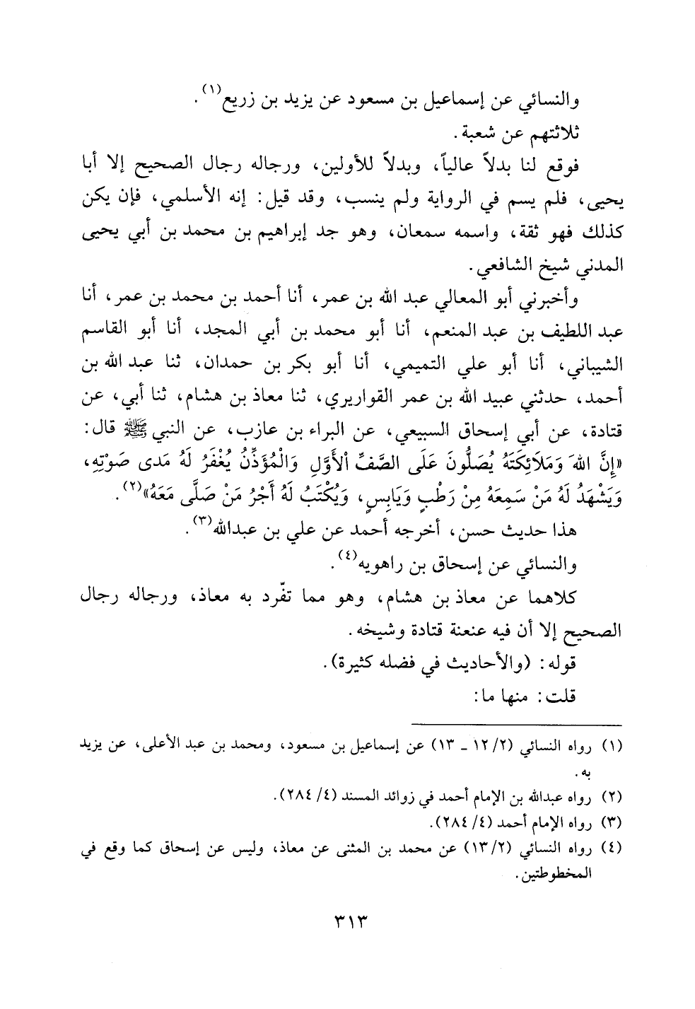 وأخبرني أبو المعالي عبد الله بن عمر، أنا أحمد بن محمد بن عمر، أنا عبد اللطيف بن عبد المنعم، أنا أبو محمد بن أبي المجد، أنا أبو القاسم الشيباني، أنا أبو علي التميمي، أنا أبو بكر بن حمدان، ثنا عبد الله بن أحمد، حدثني عبيد الله بن عمر القواريري، ثنا معاذ بن هشام، ثنا أبي، عن قتادة، عن أبي إسحاق السبيعي، عن البراء بن عازب، عن النبي صلى الله عليه وسلم قال: ((إن الله وملائكته يصلون على الصف الأول والمؤذن يغفر له مدى صوته، ويشهد له من سمعه من رطبٍ ويابسٍ، ويكتب له أجر من صلى معه)).