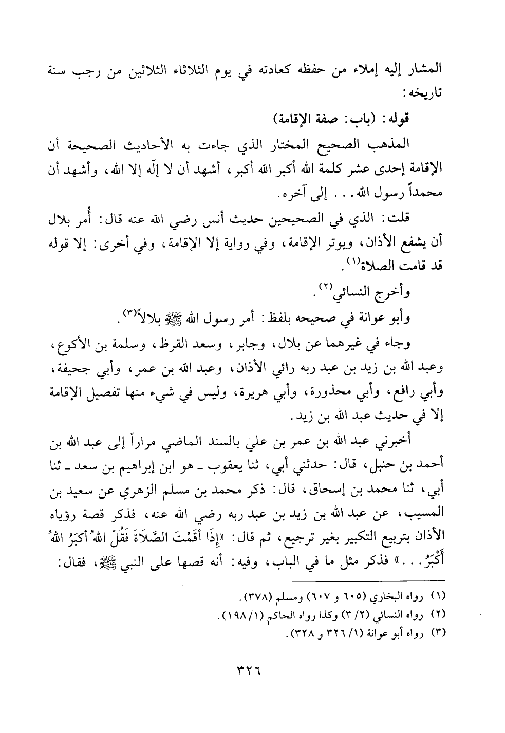 أخبرني عبد الله بن عمر بن علي بالسند الماضي مراراً إلى عبد الله بن أحمد بن حنبل، قال: حدثني أبي، ثنا يعقوب -هو ابن إبراهيم بن سعد- ثنا أبي، ثنا محمد بن إسحاق، قال: ذكر محمد بن مسلم الزهري عن سعيد بن المسيب، عن عبد الله بن زيد بن عبد ربه رضي الله عنه، فذكر قصة رؤياه الأذان بتربيع التكبير بغير ترجيع، ثم قال: ((إذا أقمت الصلاة فقل الله أكبر الله أكبر .. .. )) فذكر مثل ما في الباب، وفيه: أنه قصها على النبي صلى الله عليه وسلم فقال: