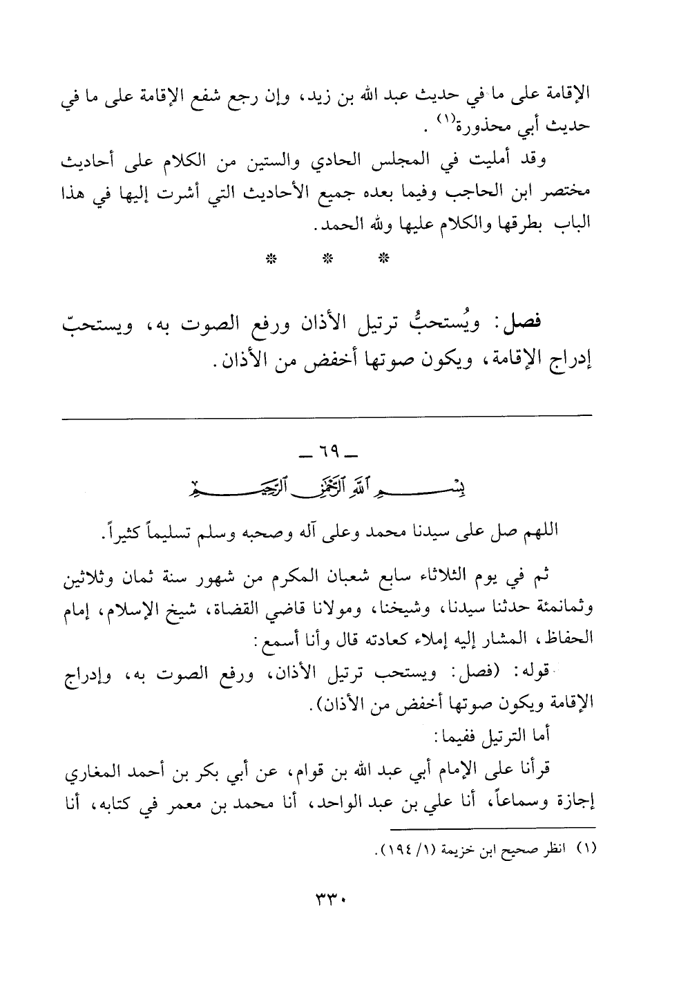 ثم في يوم الثلاثاء سابع شعبان المكرم من شهور سنة ثمان وثلاثين وثمانمئة حدثنا سيدنا، وشيخنا، ومولانا قاضي القضاة، شيخ الإسلام، إمام الحفاظ، المشار إليه إملاء كعادته قال وأنا أسمع: