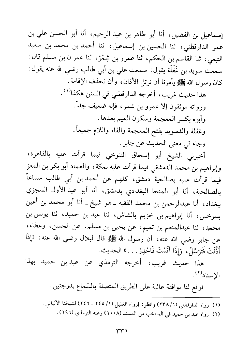 إسماعيل بن الفضل، أنا أبو طاهر بن عبد الرحيم، أنا أبو الحسن علي بن عمر الدارقطني، ثنا الحسين بن إسماعيل، ثنا أحمد بن محمد بن سعيد التبعي، ثنا القاسم بن الحكم، ثنا عمرو بن شمر، ثنا عمران بن مسلم قال: سمعت سويد بن غفلة يقول: سمعت علي بن أبي طالب رضي الله عنه يقول: كان رسول الله صلى الله عليه وسلم يأمرنا أن نرتل الأذان، وأن نحذف الإقامة.