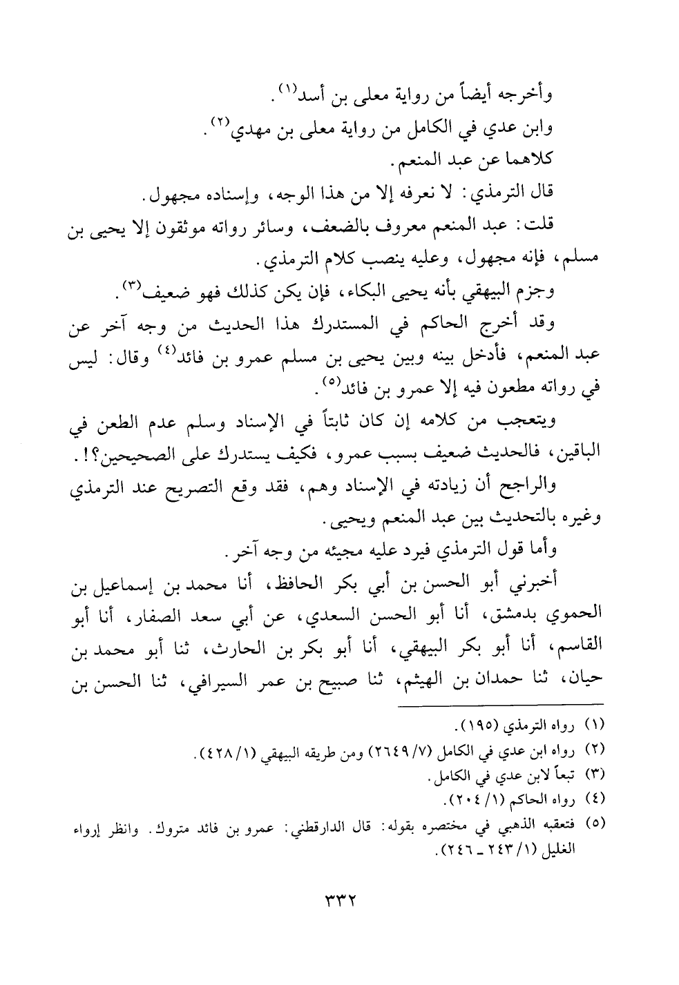 والراجح أن زيادته في الإسناد وهم، فقد وقع التصريح عند الترمذي وغيره بالتحديث بين عبد المنعم ويحيى.