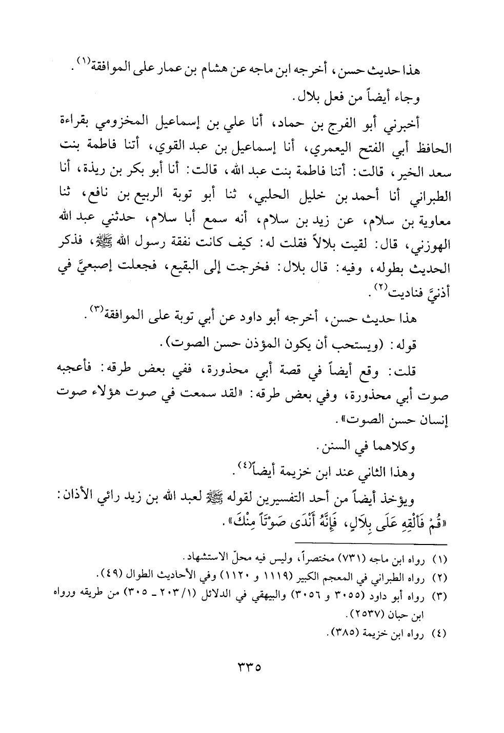 قلت: وقع أيضاً في قصة أبي محذورة، ففي بعض طرقه: فأعجبه صوت أبي محذورة، وفي بعض طرقه: ((لقد سمعت في صوت هؤلاء صوت إنسان حسن الصوت)).
