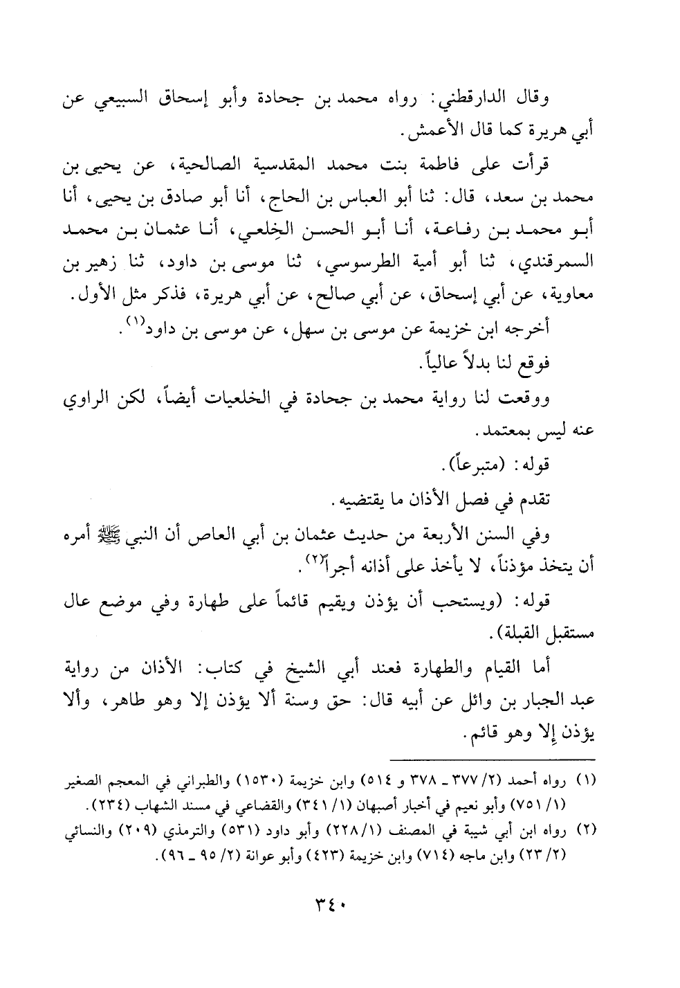 أما القيام والطهارة فعند أبي الشيخ في كتاب: الأذان من رواية عبد الجبار بن وائل عن أبيه قال: حق وسنة ألا يؤذن إلا وهو طاهر، وألا يؤذن إلا وهو قائم.