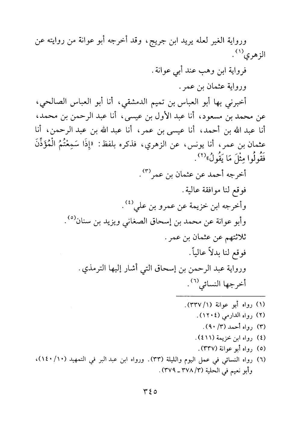 أخبرني بها أبو العباس بن تميم الدمشقي، أنا أبو العباس الصالحي، عن محمد بن مسعود، أنا عبد الأول بن عيسى، أنا عبد الرحمن بن محمد، أنا عبد الله بن أحمد، أنا عيسى بن عمر، أنا عبد الله بن عبد الرحمن، أنا عثمان بن عمر، أنا يونس، عن الزهري، فذكره بلفظ: ((إذا سمعت المؤذن فقولوا مثل ما يقول)).