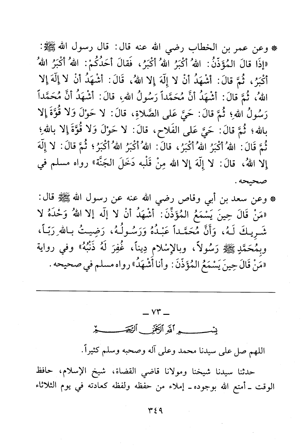 [[وعن عمر بن الخطاب رضي الله عنه قال: قال رسول الله صلى الله عليه وسلم: ((إذا قال المؤذن: الله أكبر الله أكبر، فقال أحدكم: الله أكبر الله أكبر، ثم قال: أشهد أن لا إله إلا الله، قال: أشهد أن لا إله إلا الله، ثم قال: أشهد أن محمداً رسول الله، قال: أشهد أن محمداً رسول الله؛ ثم قال: حي على الصلاة، قال: لا حول ولا قوة إلا بالله، ثم قال: حي على الفلاح: قال: لا حول ولا قوة إلا بالله؛ ثم قال: الله أكبر الله أكبر، قال: الله أكبر الله أكبر؛ ثم قال: لا إله إلا الله، قال: لا إله إلا الله من قلبه دخل الجنة)) رواه مسلم في صحيحه.