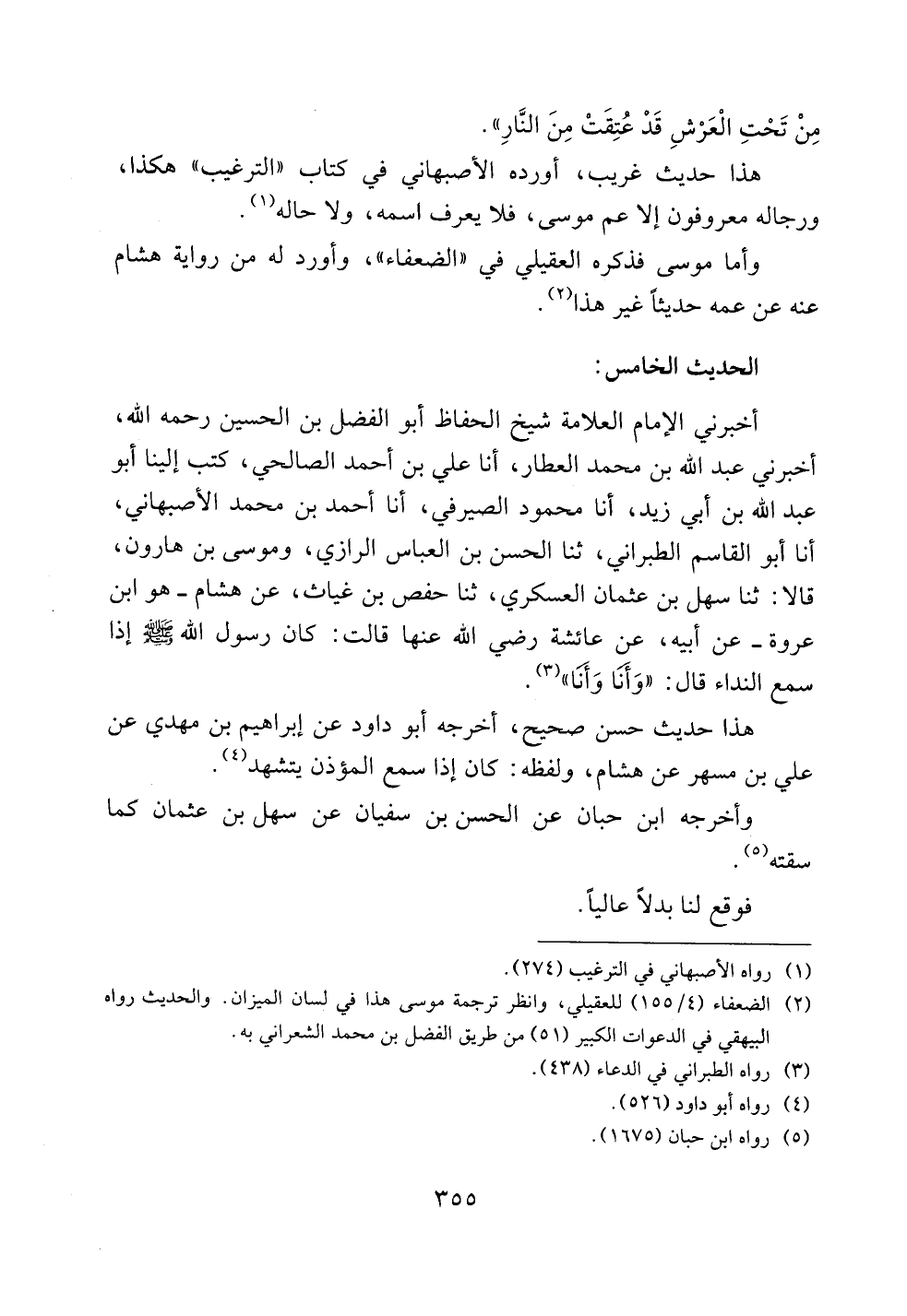 أخبرني الإمام العلامة شيخ الحفاظ أبو الفضل بن الحسين رحمه الله، أخبرني عبد الله بن محمد العطار، أنا علي بن أحمد الصالحي، كتب إلينا أبو عبد الله بن أبي زيد، أنا محمود الصيرفي، أنا أحمد بن محمد الأصبهاني، أنا أبو القاسم الطبراني، ثنا الحسن بن العباس الرازي، وموسى بن هارون، قالا: ثنا سهل بن عثمان العسكري، ثنا حفص بن غياث، عن هشام -هو ابن عروة- عن أبيه، عن عائشة رضي الله عنها قالت: كان رسول الله صلى الله عليه وسلم إذا سمع النداء قال: ((وأنا وأنا)).