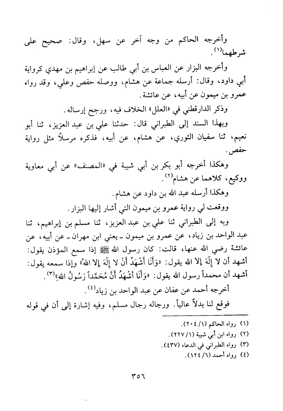 وبه إلى الطبراني ثنا علي بن عبد العزيز، ثنا مسلم بن إبراهيم، ثنا عبد الواحد بن زياد، عن عمرو بن ميمون -يعني ابن مهران- عن أبيه، عن عائشة رضي الله عنها، قالت: كان رسول الله صلى الله عليه وسلم إذا سمع المؤذن يقول: أشهد أن لا إله إلا الله يقول: ((وأنا أشهد أن لا إله إلا الله)) وإذا سمعه يقول: أشهد أن محمداً رسول الله يقول: ((وأنا أشهد أن محمداً رسول الله)).