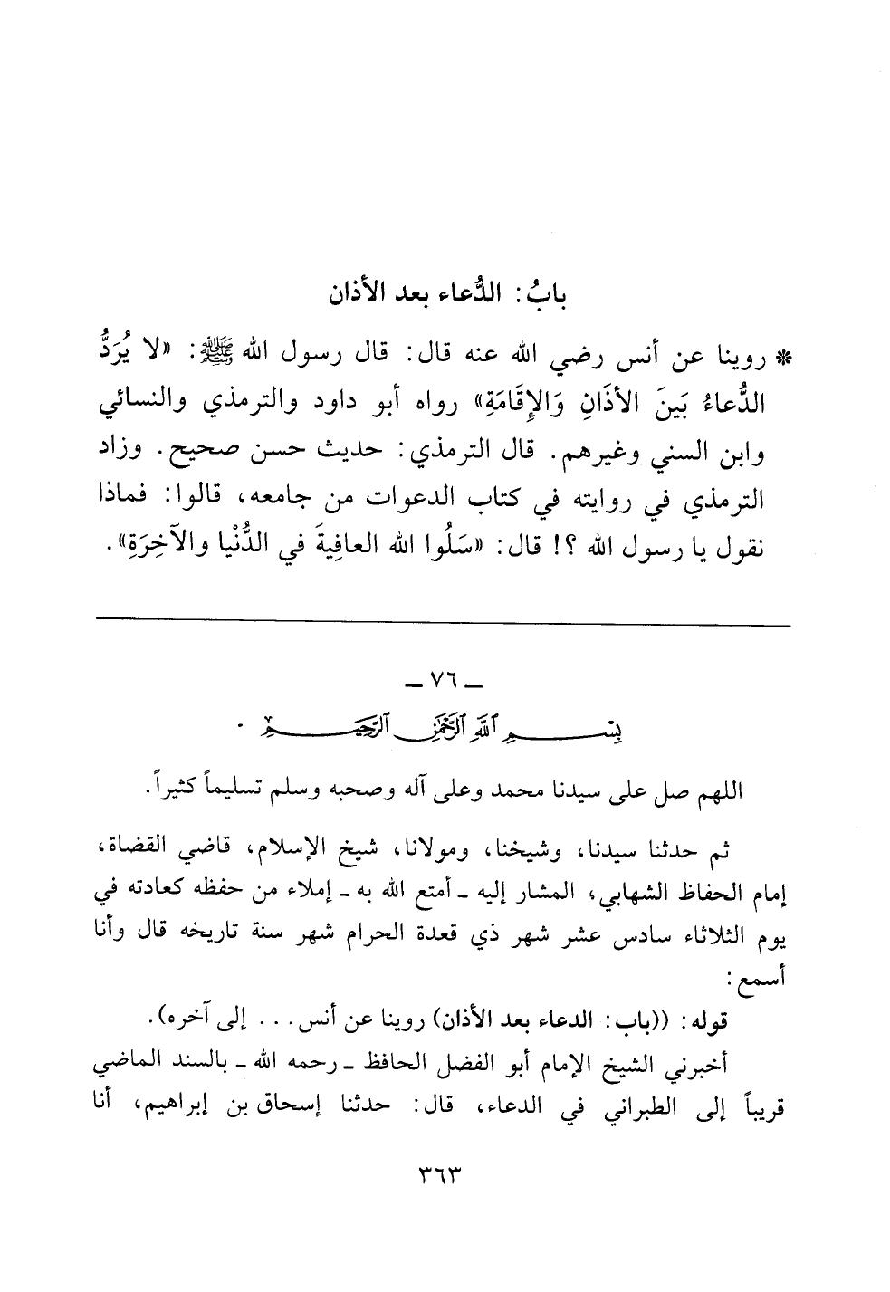 قوله: ((باب: الدعاء بعد الأذان) روينا عن أنس .. إلى أخره).