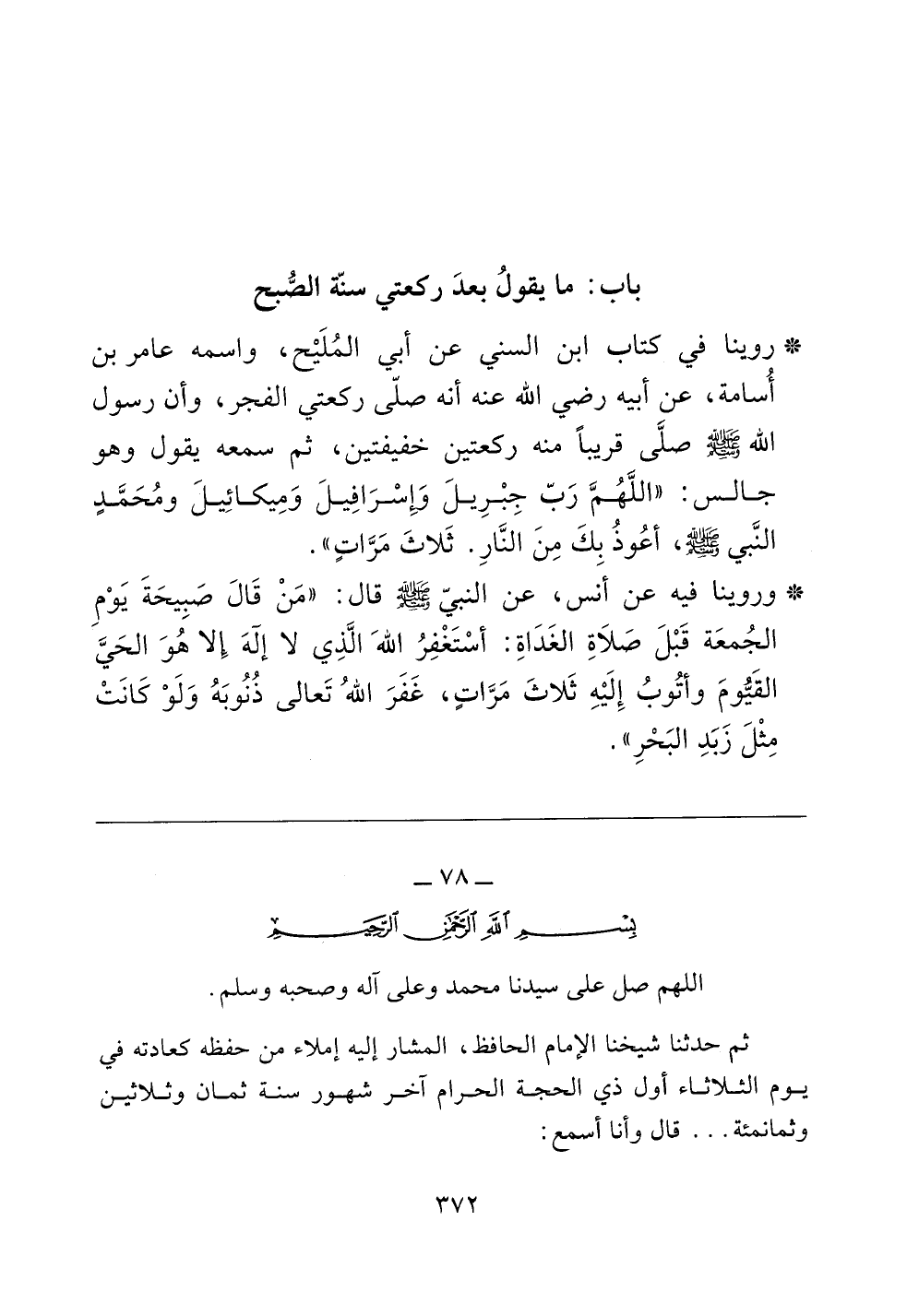 روينا في كتاب ابن السني عن أبي المليح، واسمه عامر بن أسامة، عن أبيه رضي الله عنه أنه صلى ركعتي الفجر، وأن رسول الله صلى الله عليه وسلم صلى قريباً منه ركعتين خفيفتين، ثم سمعه يقول وهو جالس: ((اللهم رب جبريل وإسرافيل وميكائيل ومحمدٍ النبي صلى الله عليه وسلم، أعوذ بك من النار. ثلاث مراتٍ)).