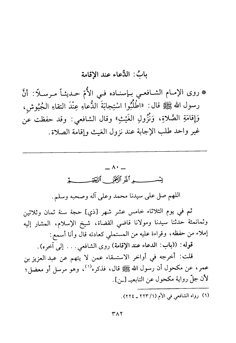 قوله: (باب: الدعاء عند الإقامة روى الشافعي .. إلى آخره).