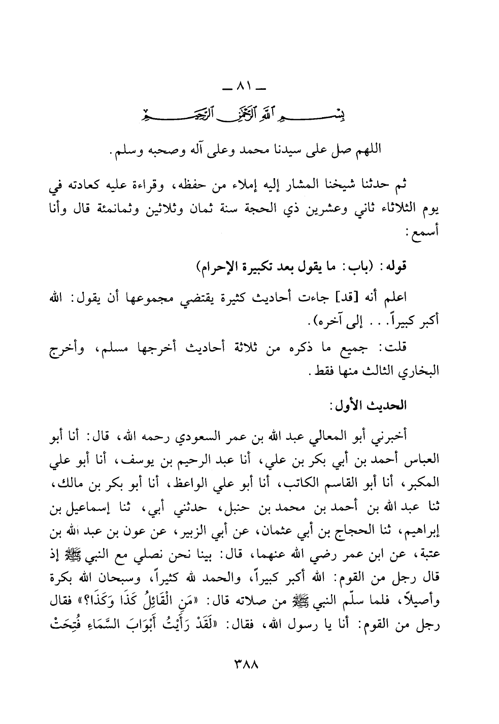 أخبرني أبو المعالي عبد الله بن عمر السعودي رحمه الله، قال: أنا أبو العباس أحمد بن أبي بكر بن علي، أنا عبد الرحيم بن يوسف، أنا أبو علي المكبر، أنا أبو القاسم الكاتب، أنا أبو علي الواعظ، أنا أبو بكر بن مالك، ثنا عبد الله بن أحمد بن محمد بن حنبل، حدثني أبي، ثنا إسماعيل بن إبراهيم، ثنا الحجاج بن أبي عثمان، عن أبي الزبير، عن عون بن عبد الله بن عتبة، عن ابن عمر رضي الله عنهما، قال: بينا نحن نصلي مع النبي صلى الله عليه وسلم إذ قال رجل من القوم: الله أكبر كبيراً، والحمد لله كثيراً، وسبحان الله بكرة وأصيلاً، فلما سلم النبي صلى الله عليه وسلم من صلاته قال: ((من القائل كذا وكذا؟)) فقال رجل من القوم: أنا يا رسول الله، فقال: ((لقد رأيت أبواب السماء فتحت
