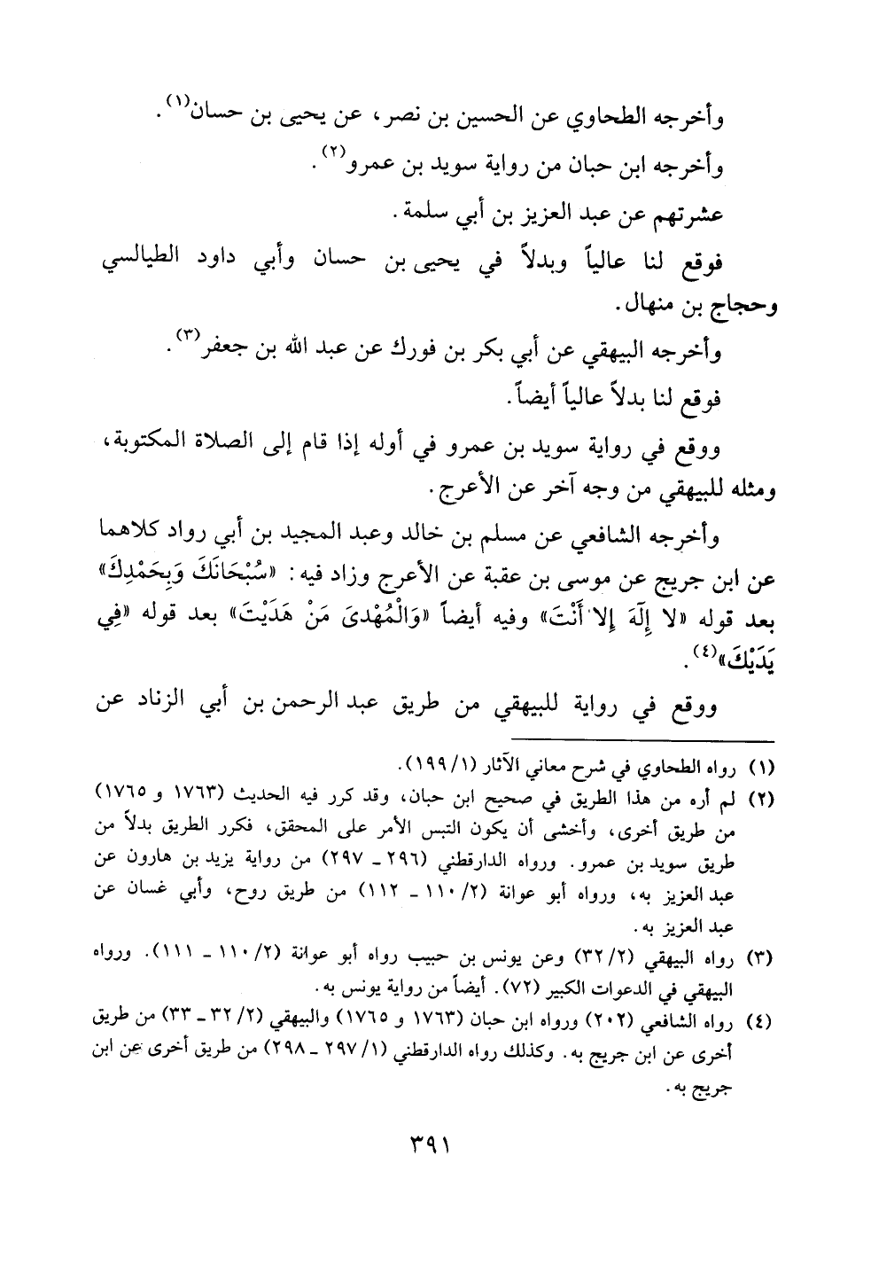 وأخرجه الشافعي عن مسلم بن خالد وعبد المجيد بن أبي رواد كلاهما عن ابن جريج عن موسى بن عقبة عن الأعرج وزاد فيه: ((سبحانك وبحمدك)) بعد قوله ((لا إله إلا أنت)) وفيه أيضاً ((والمهدى من هديت)) بعد قوله ((في يديك)).