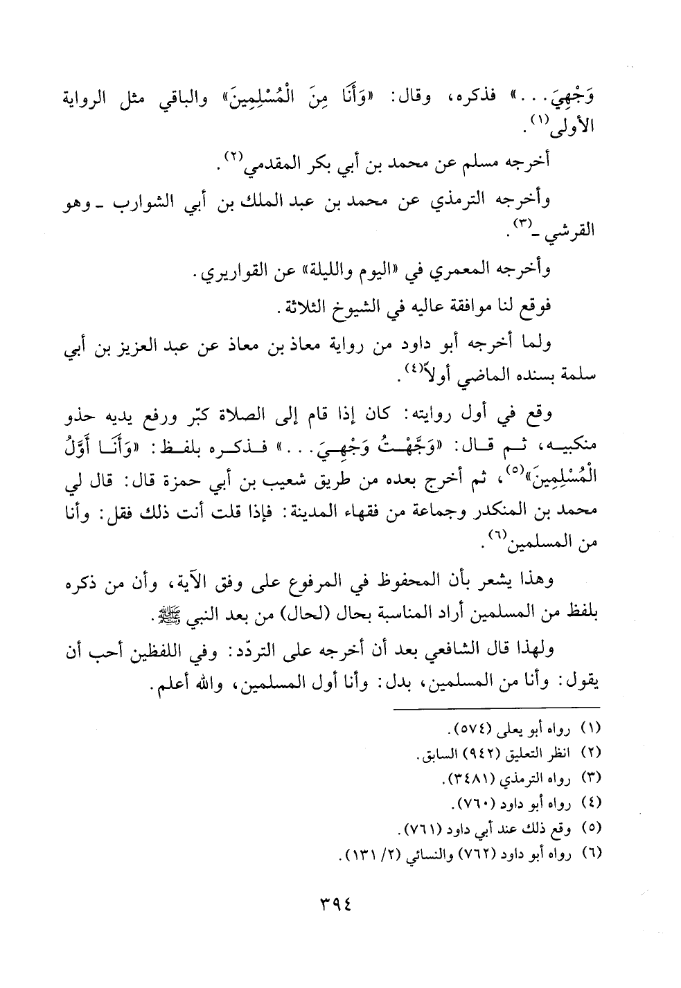 وقع في أول روايته: كان إذا قام إلى الصلاة كبر ورفع يديه حذو منكبيه، ثم قال: ((وجهت وجهي ..)) فذكره بلفظ: ((وأنا أول المسلمين))، ثم أخرج بعده من طريق شعيب بن أبي حمزة قال: قال لي محمد بن المنكدر وجماعة من فقهاء المدينة: فإذا قلت أنت ذلك فقل: وأنا من المسلمين.