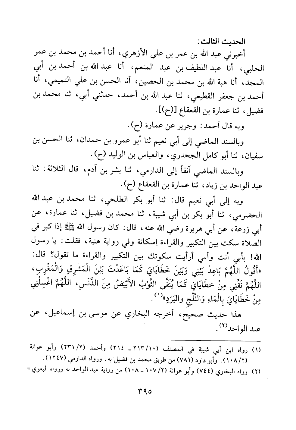 وبه إلى أبي نعيم قال: ثنا أبو بكر الطلحي، ثنا محمد بن عبد الله الحضرمي، ثنا أبو بكر بن أبي شيبة، ثنا محمد بن فضيل، ثنا عمارة، عن أبي زرعة، عن أبي هريرة رضي الله عنه، قال: كان رسول الله صلى الله عليه وسلم إذا كبر في الصلاة سكت بين التكبير والقراءة إسكاتة وفي رواية هنية، فقلت: يا رسول الله! بأبي أنت وأمي أرأيت سكوتك بين التكبير والقراءة ما تقول؟ قال: ((أقول اللهم باعد بيني وبين خطاياي كما باعدت بين المشرق والمغرب، اللهم نقني من خطاياي كما ينقى الثوب الأبيض من الدنس، اللهم اغسلني من خطاياي بالماء والثلج والبرد)).