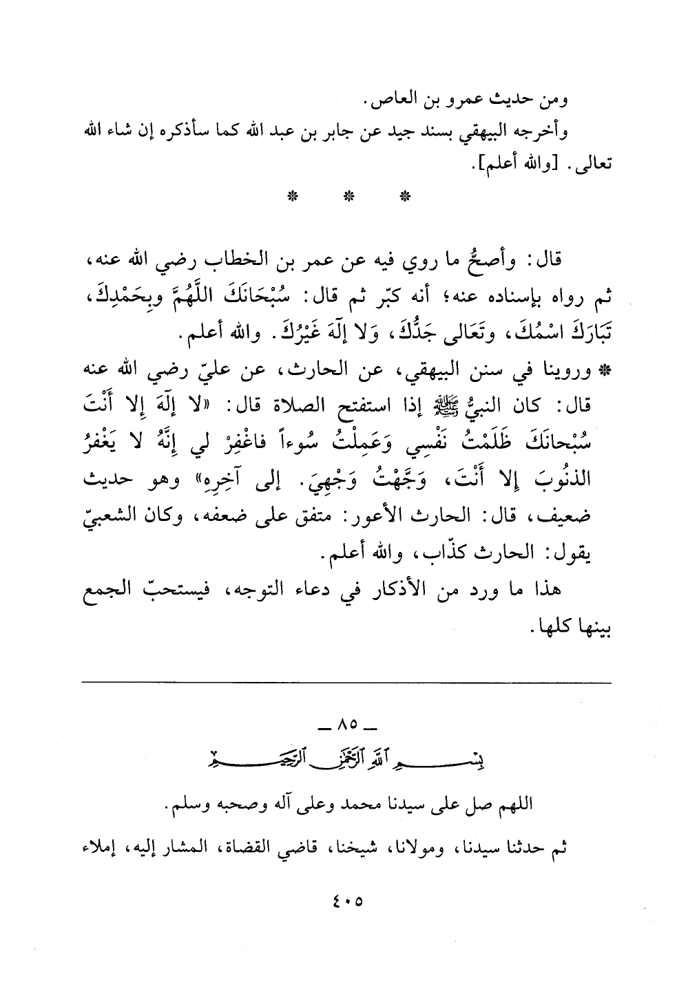 وروينا في سنن البيهقي، عن الحارث، عن علي رضي الله عنه قال: كان النبي صلى الله عليه وسلم إذا استفتح الصلاة قال: ((لا إله إلا أنت سبحانك ظلمت نفسي وعملت سوءاً فاغفر لي إنه لا يغفر الذنوب إلا أنت، وجهت وجهي، إلى آخره)) وهو حديث ضعيف، قال: الحارث الأعور: متفق على ضعفه، وكان الشعبي يقول: الحارث كذاب، والله أعلم.
