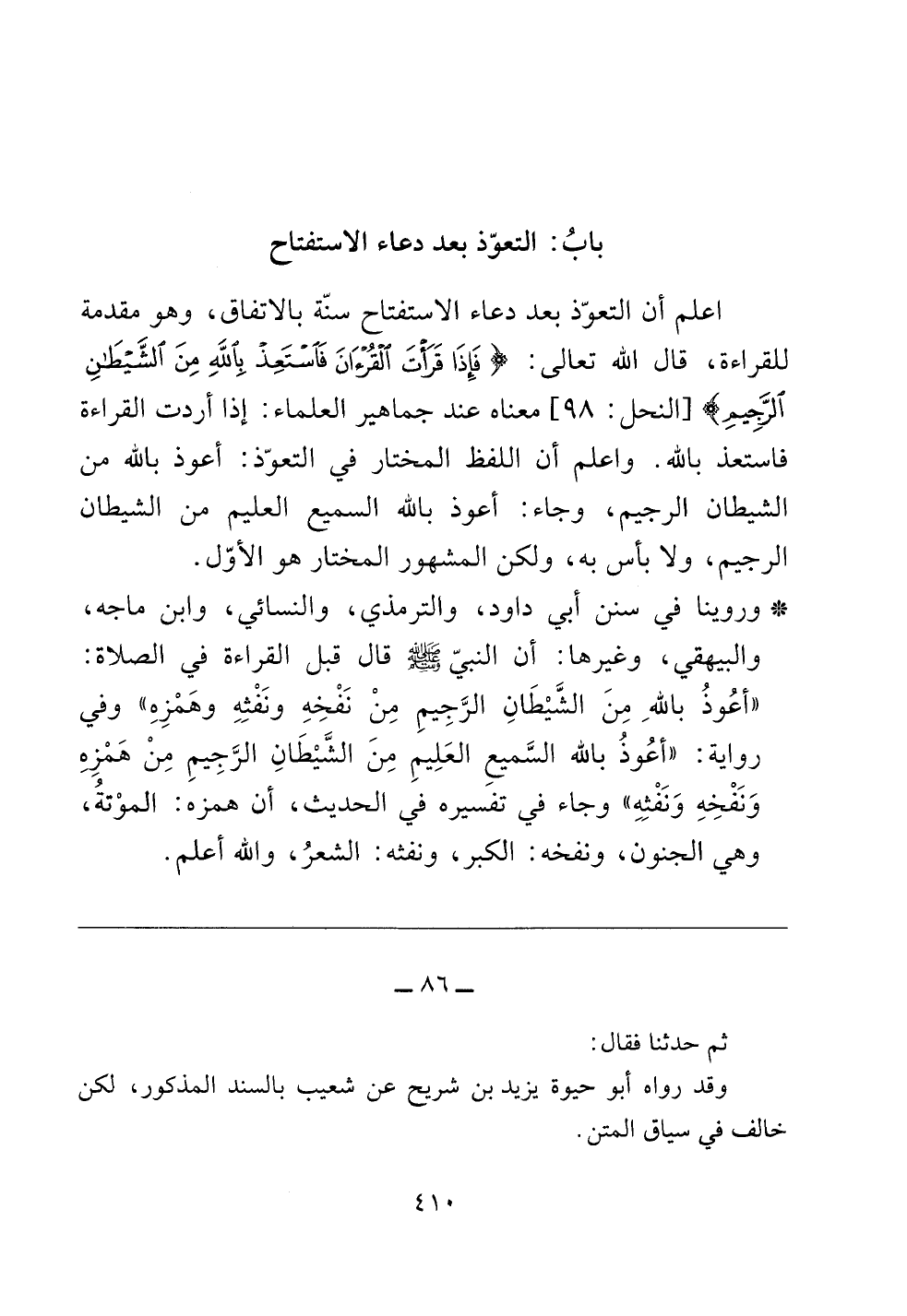وروينا في سنن أبي داود، والترمذي، والنسائي، وابن ماجه، والبيهقي، وغيرها: أن النبي صلى الله عليه وسلم قال قبل القراءة في الصلاة: ((أعوذ بالله من الشيطان الرجيم من نفخه ونفثه وهمزه)) وفي رواية: ((أعوذ بالله السميع العليم من الشيطان الرجيم من همزه ونفخه ونفثه)) وجاء في تفسيره في الحديث، أن همزه: الموتة، وهي الجنون، ونفخه: الكبر، ونفثه: الشعر، والله أعلم.]]