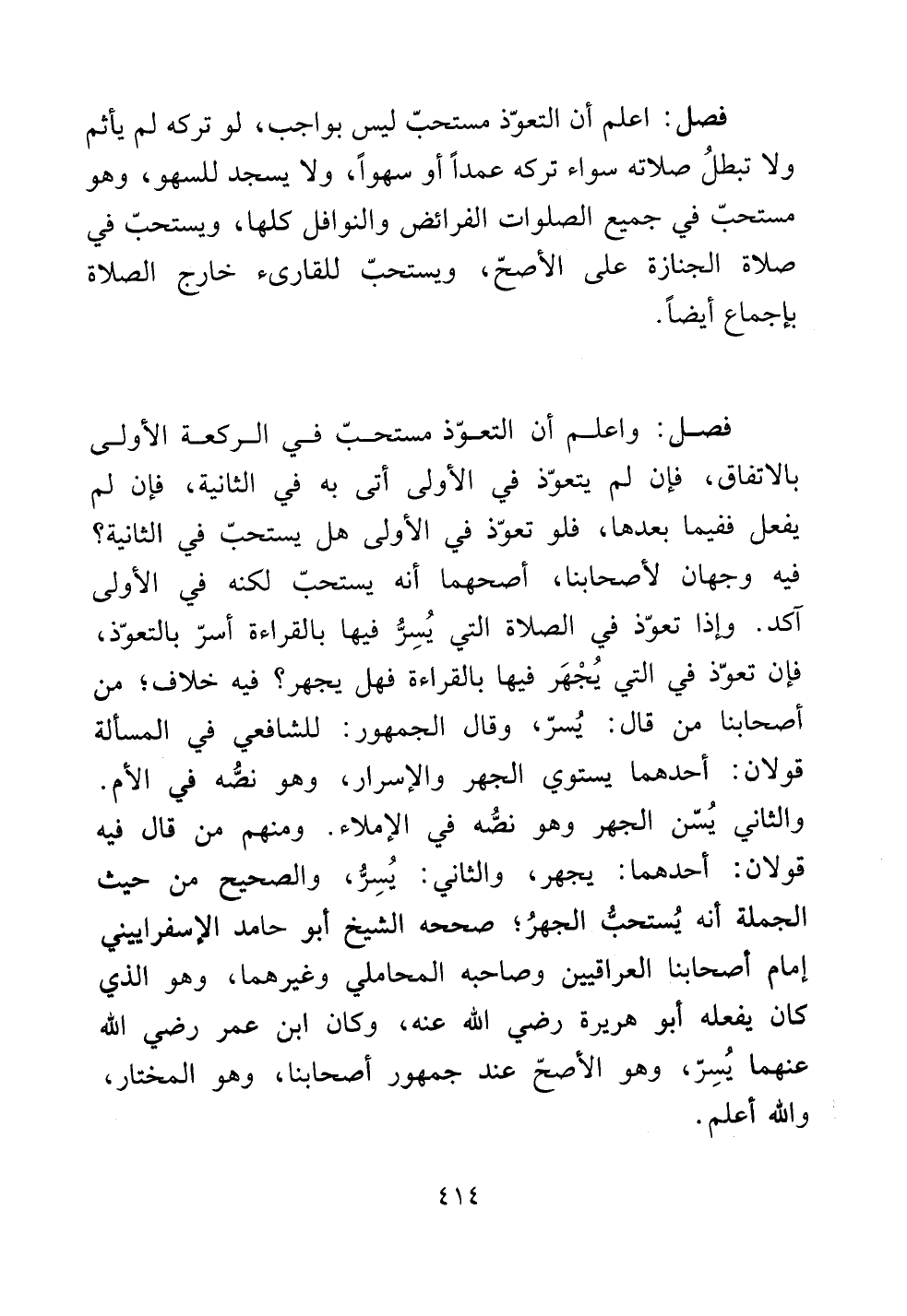 [[فصل: اعلم أن التعوذ مستحبٌ ليس بواجب، لو تركه لم يأثم ولا تبطل صلاته سواء تركه عمداً أو سهواً، ولا يسجد للسهو، وهو مستحبٌ في جميع الصلوات الفرائض والنوافل كلها، ويستحب في صلاة الجنازة على الأصح، ويستحب للقارئ خارج الصلاة بإجماع أيضاً.