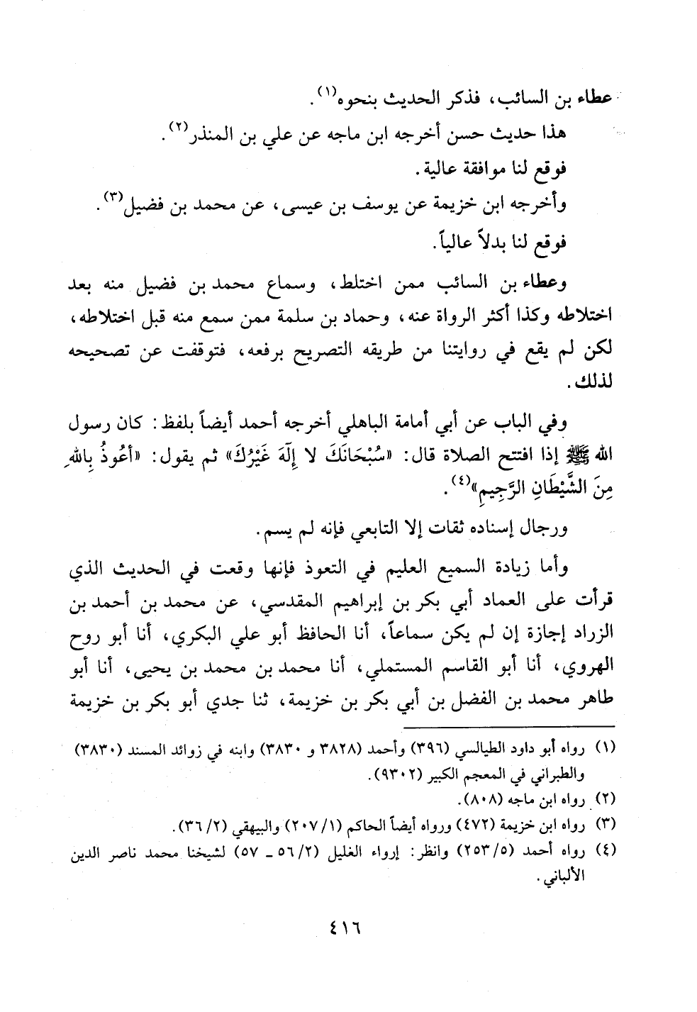 وأما زيادة السميع العليم في التعوذ فإنها وقعت في الحديث الذي قرأت على العماد أبي بكر بن إبراهيم المقدسي، عن محمد بن أحمد بن الزراد إجازة إن لم يكن سماعاً، أنا الحافظ أبو علي البكري، أنا أبو روح الهروي، أنا أبو القاسم المستملي، أنا محمد بن محمد بن يحيى أنا أبو طاهر محمد بن الفضل بن أبي بكر بن خزيمة، ثنا جدي أبو بكر بن خزيمة