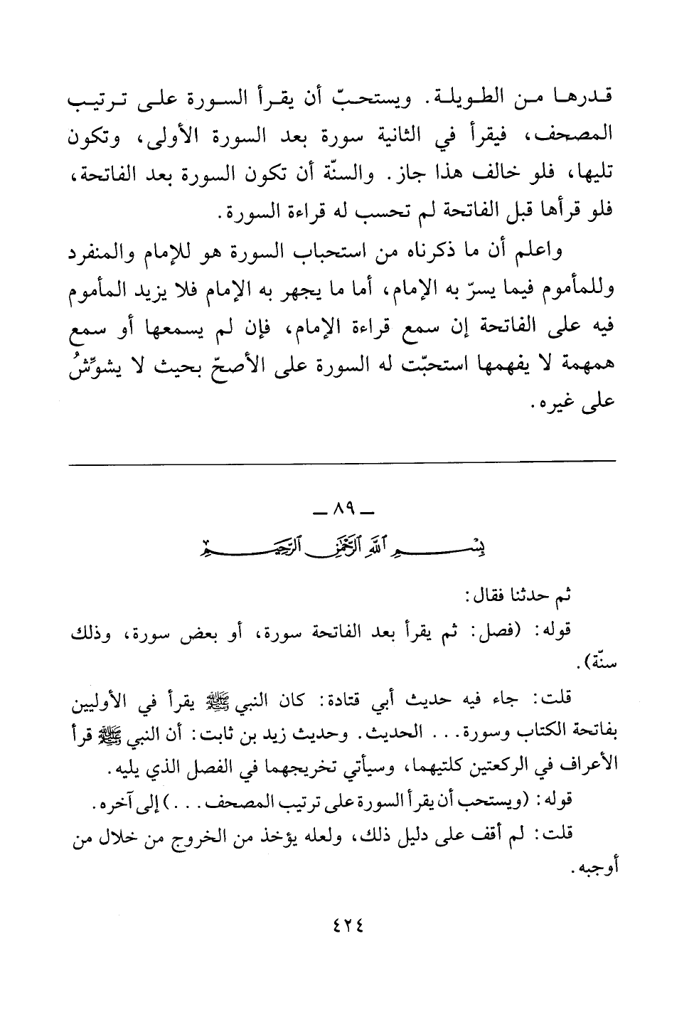 قدرها من الطويلة. ويستحب أن يقرأ السورة على ترتيب المصحف، فيقرأ في الثانية سورة بعد السورة الأولى، وتكون تليها، فلو خالف هذا جاز. والسنة أن تكون السورة بعد الفاتحة، فلو قرأها قبل الفاتحة لم تحسب له قراءة السورة.