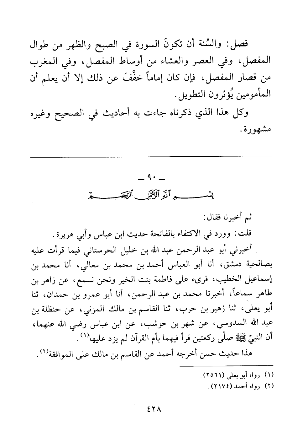 أخبرني أبو عبد الرحمن عبد الله بن خليل الحرستاني فيما قرأت عليه بصالحية دمشق، أنا أبو العباس أحمد بن محمد بن معالي، أنا محمد بن إسماعيل الخطيب، قرئ على فاطمة بنت الخير ونحن نسمع، عن زاهر بن طاهر سماعاً، أخبرنا محمد بن عبد الرحمن، أنا أبو عمرو بن حمدان، ثنا أبو يعلى، ثنا زهير بن حرب، ثنا القاسم بن مالك المزني، عن حنظلة بن عبد الله السدوسي، عن شهر بن حوشب، عن ابن عباس رضي الله عنهما، أن النبي صلى الله عليه وسلم صلى ركعتين قرأ فيهما بأم القرآن لم يزد عليها.