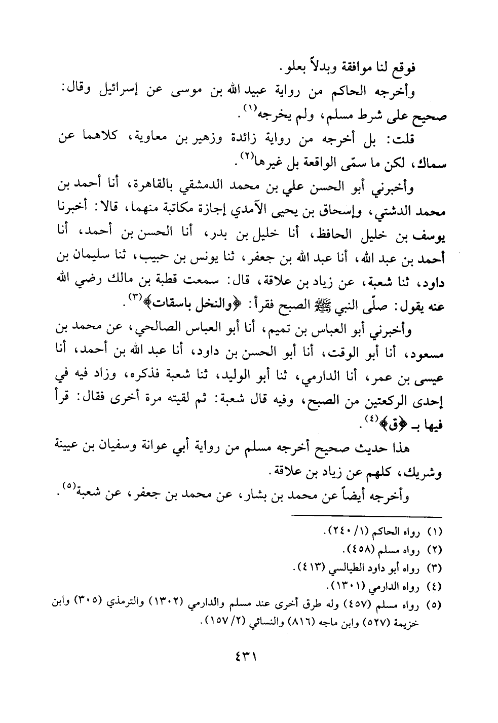 وأخبرني أبو الحسن علي بن محمد الدمشقي بالقاهرة، أنا أحمد بن محمد الدشتي، وإسحاق بن يحيى الآمدي إجازة مكاتبة منهما، قالا: أخبرنا يوسف بن خليل الحافظ، أنا خليل بن بدر، أنا الحسن بن أحمد، أنا أحمد بن عبد الله، أنا عبد الله بن جعفر، ثنا يونس بن حبيب، ثنا سليمان بن داود، ثنا شعبة، عن زياد بن علاقة، قال: سمعت قطبة بن مالك رضي الله عنه يقول: صلى النبي صلى الله عليه وسلم الصبح فقرأ: {والنخل باسقات}.