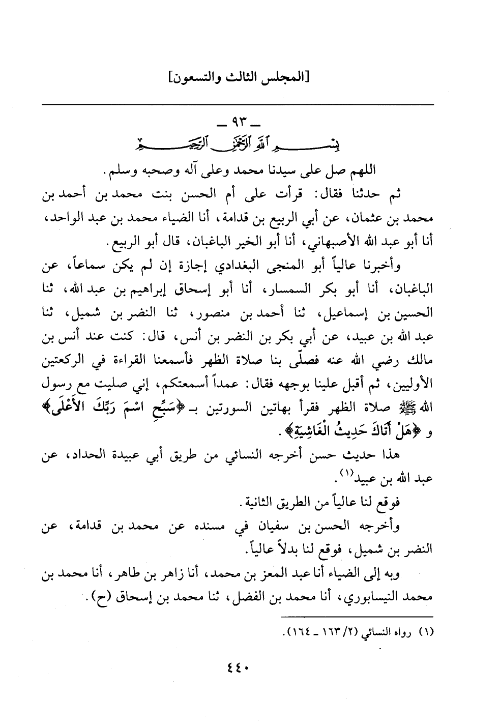 وأخبرنا عالياً أبو المنجى البغدادي إجازة إن لم يكن سماعاً، عن الباغبان، أنا أبو بكر السمسار، أنا أبو إسحاق إبراهيم بن عبد الله، ثنا الحسين بن إسماعيل، ثنا أحمد بن منصور، ثنا النضر بن شميل، ثنا عبد الله بن عبيد، عن أبي بكر بن النضر بن أنس، قال: كنت عند أنس بن مالك رضي الله عنه فصلى بنا صلاة الظهر فأسمعنا القراءة في الركعتين الأوليين، ثم أقبل علينا بوجهه فقال: عمداً أسمعتكم، إني صليت مع رسول الله صلى الله عليه وسلم صلاة الظهر فقرأ بهاتين السورتين بـ {سبح اسم ربك الأعلى} و{هل أتاك حديث الغاشية}.