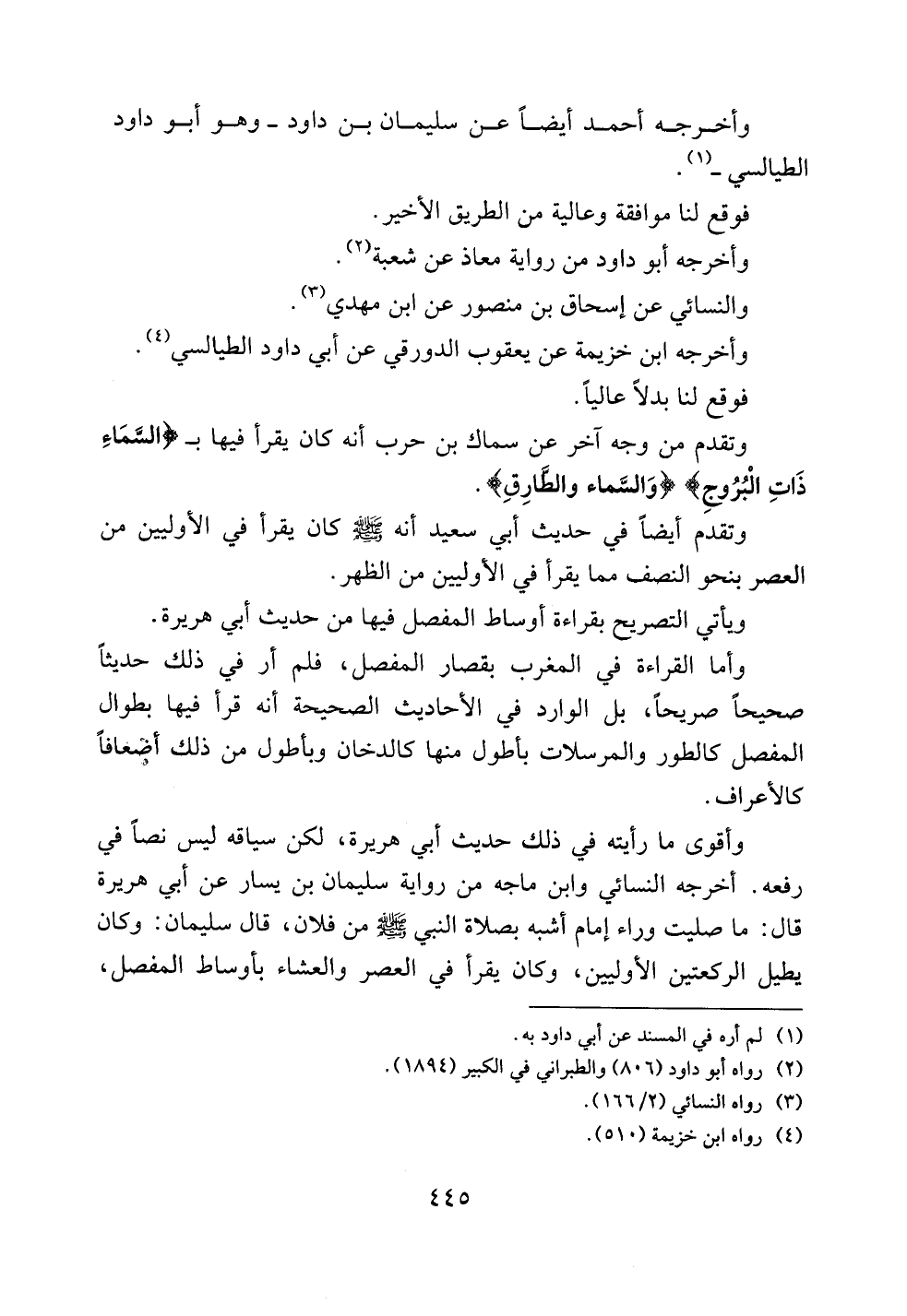 وأما القراءة في المغرب بقصار المفصل، فلم أر في ذلك حديثاً صحيحاً صريحاً، بل الوارد في الأحاديث الصحيحة أنه قرأ فيها بطوال المفصل كالطور والمرسلات بأطول منها كالدخان وبأطول من ذلك أضعافاً كالأعراف.