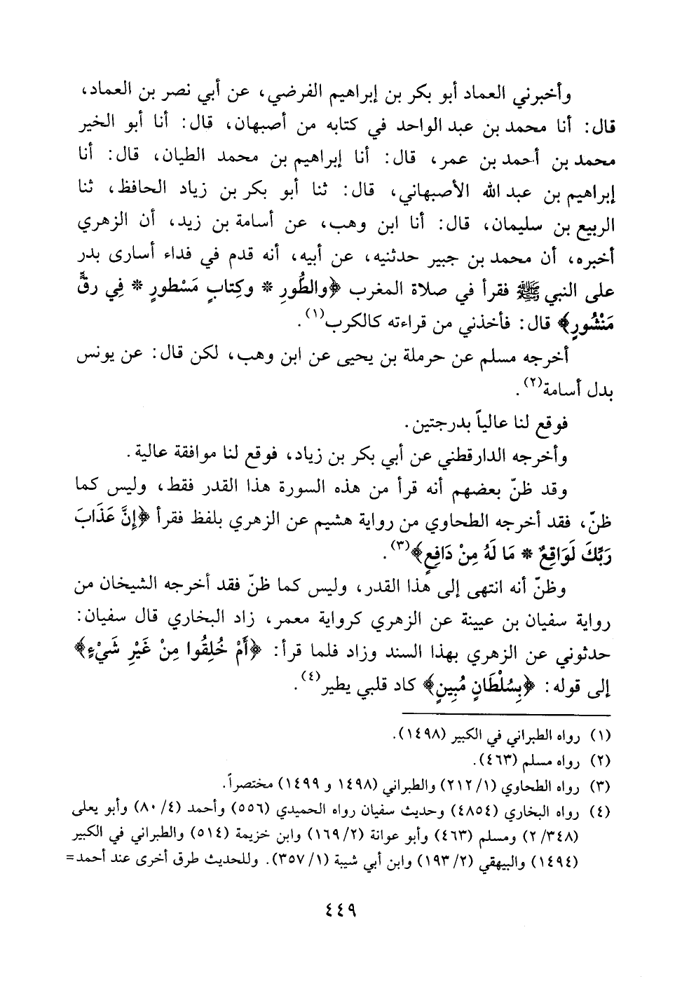 وأخبرني العماد أبو بكر بن إبراهيم الفرضي، عن أبي نصر بن العماد، قال: أنا محمد بن عبد الواحد في كتابه من أصبهان، قال: أنا أبو الخير محمد بن أحمد بن عمر، قال: أنا إبراهيم بن محمد الطيان، قال: أنا إبراهيم بن عبد الله الأصبهاني، قال: ثنا أبو بكر بن زياد الحافظ، ثنا الربيع بن سليمان، قال: أنا ابن وهب، عن أسامة بن زيد، أن الزهري أخبره، أن محمد بن جبير حدثنيه، عن أبيه، أنه قدم في فداء أسارى بدر على النبي صلى الله عليه وسلم فقرأ في صلاة المغرب {والطور. وكتابٍ مسطورٍ. في رق منشورٍ} قال: فأخذني من قراءته كالكرب.