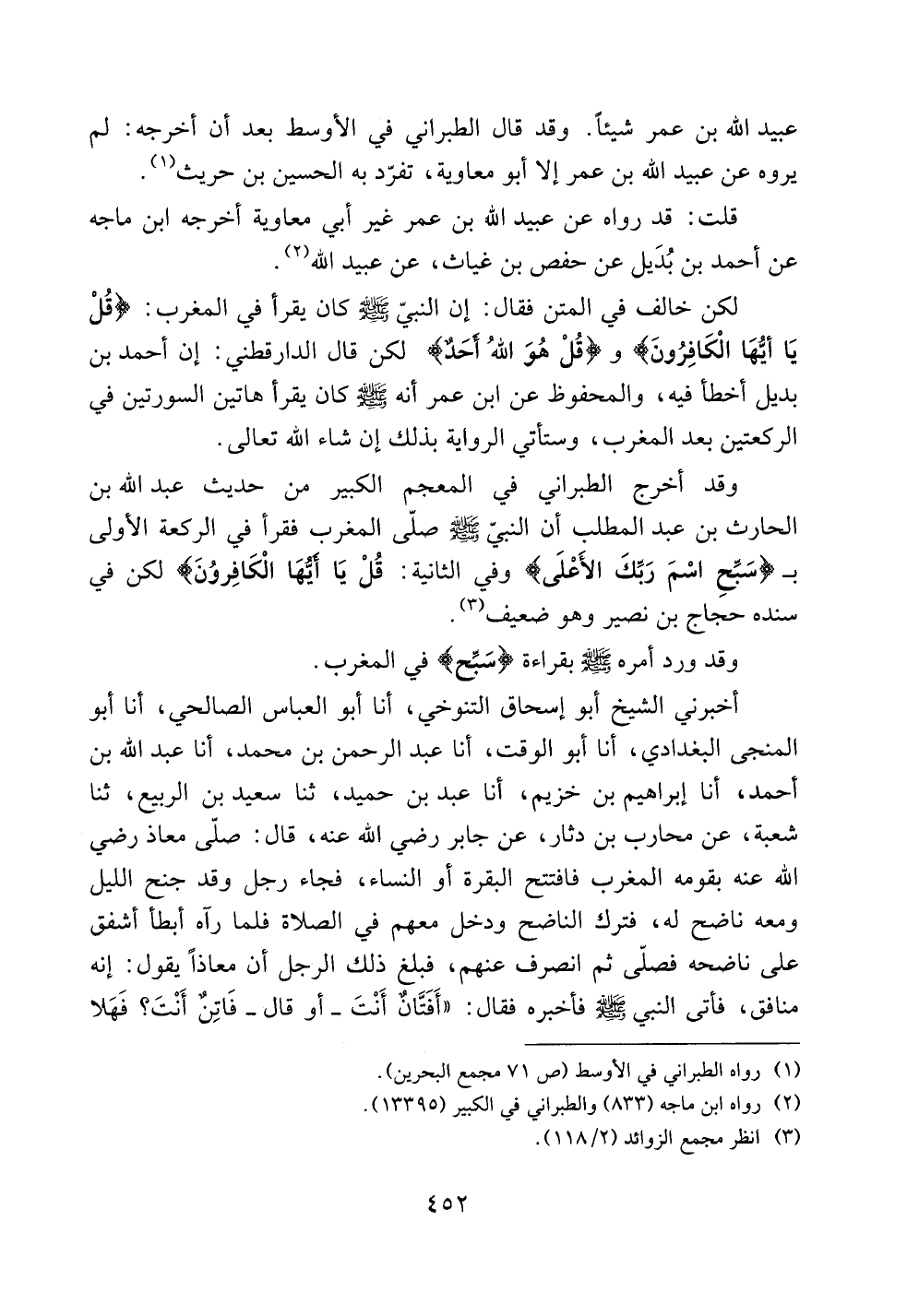 وقد أخرج الطبراني في المعجم الكبير من حديث عبد الله بن الحارث بن عبد المطلب أن النبي صلى الله عليه وسلم صلى المغرب فقرأ في الركعة الأولى بـ {سبح اسم ربك الأعلى} وفي الثانية: {قل يا أيها الكافرون} لكن في سنده حجاج بن نصير وهو ضعيف.