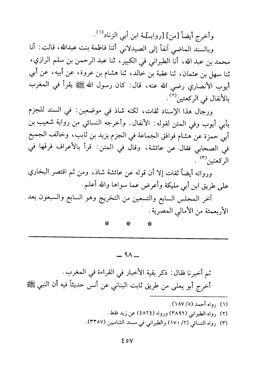 وبالسند الماضي آنفاً إلى الصيدلاني أتنا فاطمة بنت عبد الله، قالت: أنا محمد بن عبد الله، أنا الطبراني في الكبير، ثنا عبد الرحمن بن سلم الرازي، ثنا سهل بن عثمان، ثنا عقبة بن خالد، ثنا هشام بن عروة، عن أبيه، عن أبي أيوب الأنصاري رضي الله عنه، قال: كان رسول الله صلى الله عليه وسلم يقرأ في المغرب بالأنفال في الركعتين.
