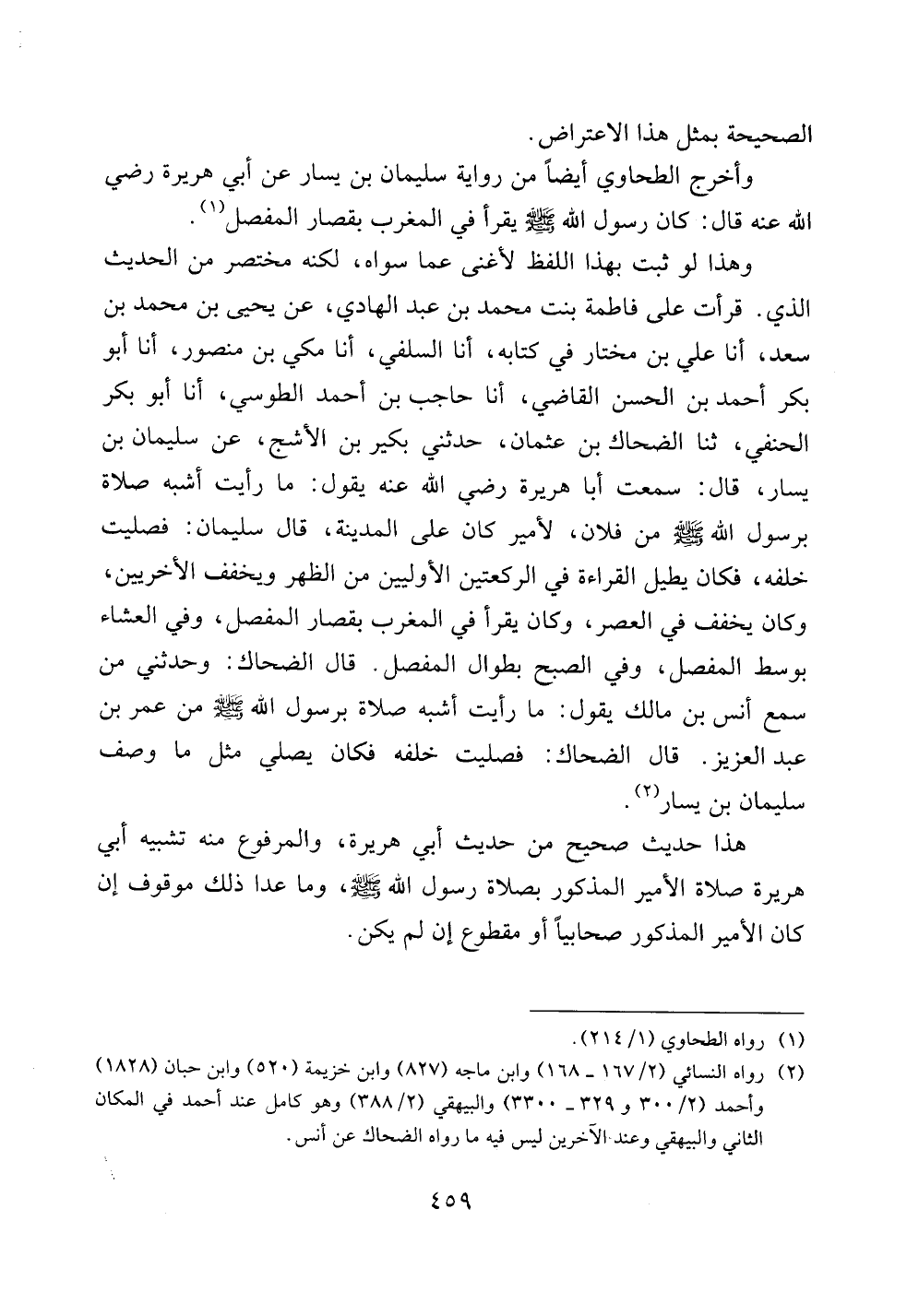 وهذا لو ثبت بهذا اللفظ لأغنى عما سواه، لكنه مختصر من الحديث الذي. قرأت على فاطمة بنت محمد بن عبد الهادي، عن يحيى بن محمد بن سعد، أنا علي بن مختار في كتابه، أنا السلفي، أنا مكي بن منصور، أنا أبو بكر أحمد بن الحسن القاضي، أنا حاجب بن أحمد الطوسي، أنا أبو بكر الحنفي، ثنا الضحاك بن عثمان، حدثني بكير بن الأشج، عن سليمان بن يسار، قال: سمعت أبا هريرة رضي الله عنه يقول: ما رأيت أشبه صلاة برسول الله صلى الله عليه وسلم من فلان، لأمير كان على المدينة، قال سليمان: فصليت خلفه، فكان يطيل القراءة في الركعتين الأوليين من الظهر ويخفف الأخريين، وكان يخفف في العصر، وكان يقرأ في المغرب بقصار المفصل، وفي العشاء بوسط المفصل، وفي الصبح بطوال المفصل. قال الضحاك: وحدثني من سمع أنس بن مالك يقول: ما رأيت أشبه صلاة برسول الله صلى الله عليه وسلم من عمر بن عبد العزيز. قال الضحاك: فصليت خلفه فكان يصلي مثل ما وصف سليمان بن يسار.