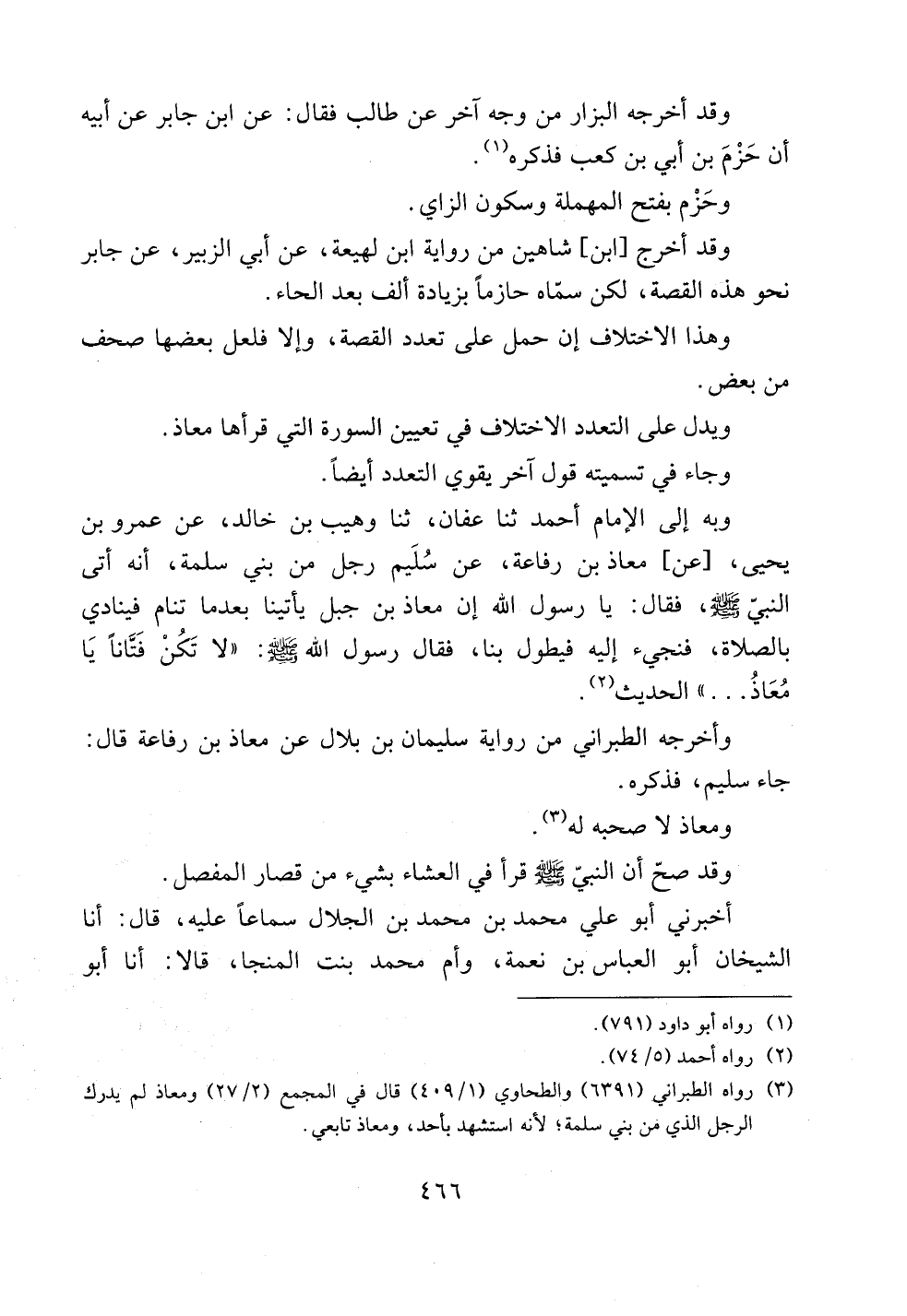 وبه إلى الإمام أحمد ثنا عفان، ثنا وهيب بن خالد، عن عمرو بن يحيى، [عن] معاذ بن رفاعة، عن سليم رجل من بني سلمة، أنه أتى النبي صلى الله عليه وسلم، فقال: يا رسول الله إن معاذ بن جبل يأتينا بعدما تنام فينادي بالصلاة، فتجيء إليه فيطول بنا، فقال رسول الله صلى الله عليه وسلم: ((لا تكن فتاناً يا معاذ .. .. )) الحديث.
