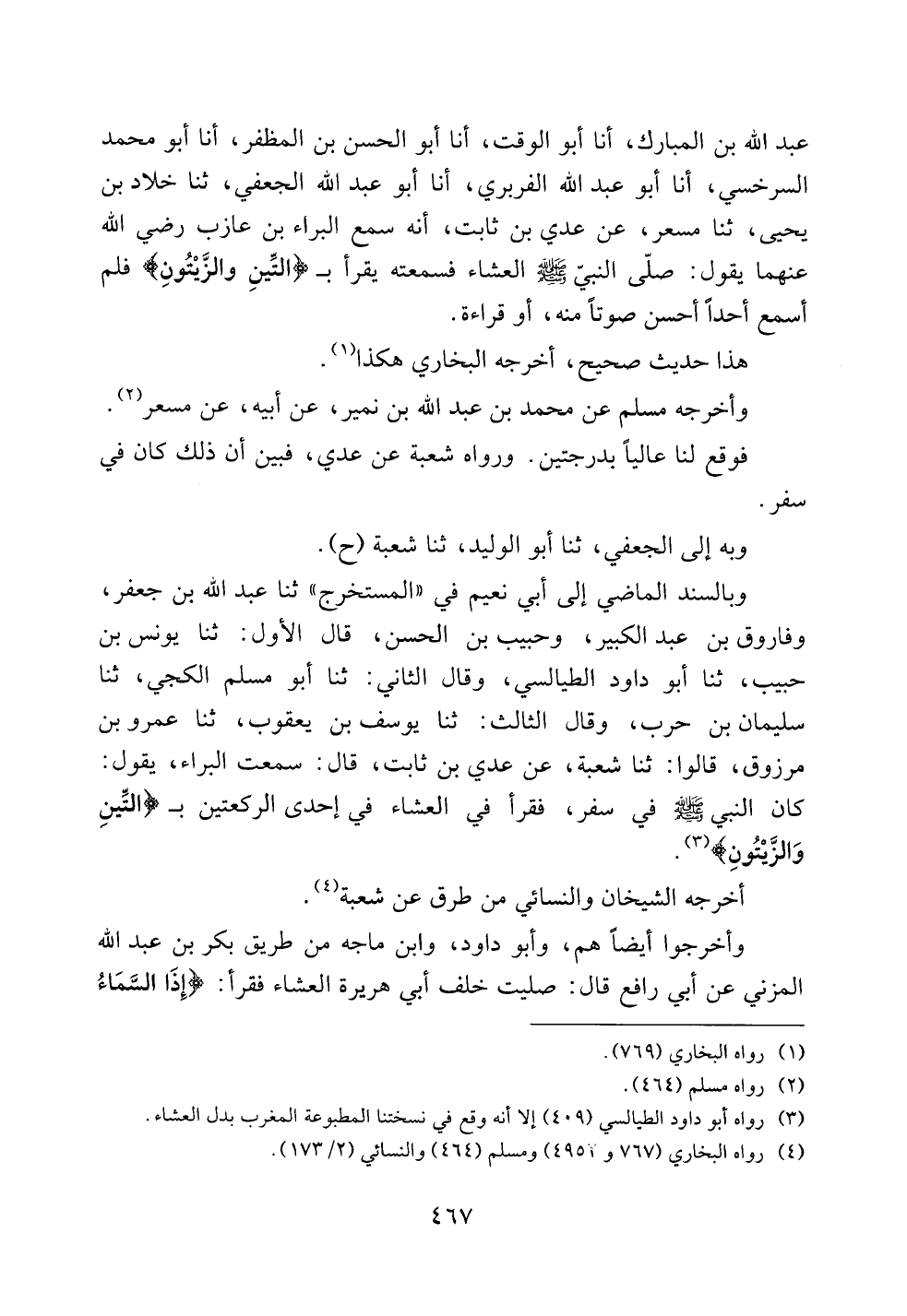 وبالسند الماضي إلى أبي نعيم في ((المستخرج)) ثنا عبد الله بن جعفر، وفاروق بن عبد الكبير، وحبيب بن الحسن، قال الأول: ثنا يونس بن حبيب، ثنا أبو داود الطيالسي، وقال الثاني: ثنا أبو مسلم الكجي، ثنا سليمان بن حرب، وقال الثالث: ثنا يوسف بن يعقوب، ثنا عمرو بن مرزوق، قالوا: ثنا شعبة، عن عدي بن ثابت، قال: سمعت البراء، يقول: كان النبي صلى الله عليه وسلم في سفر، فقرأ في العشاء في إحدى الركعتين بـ {التين والزيتون}.