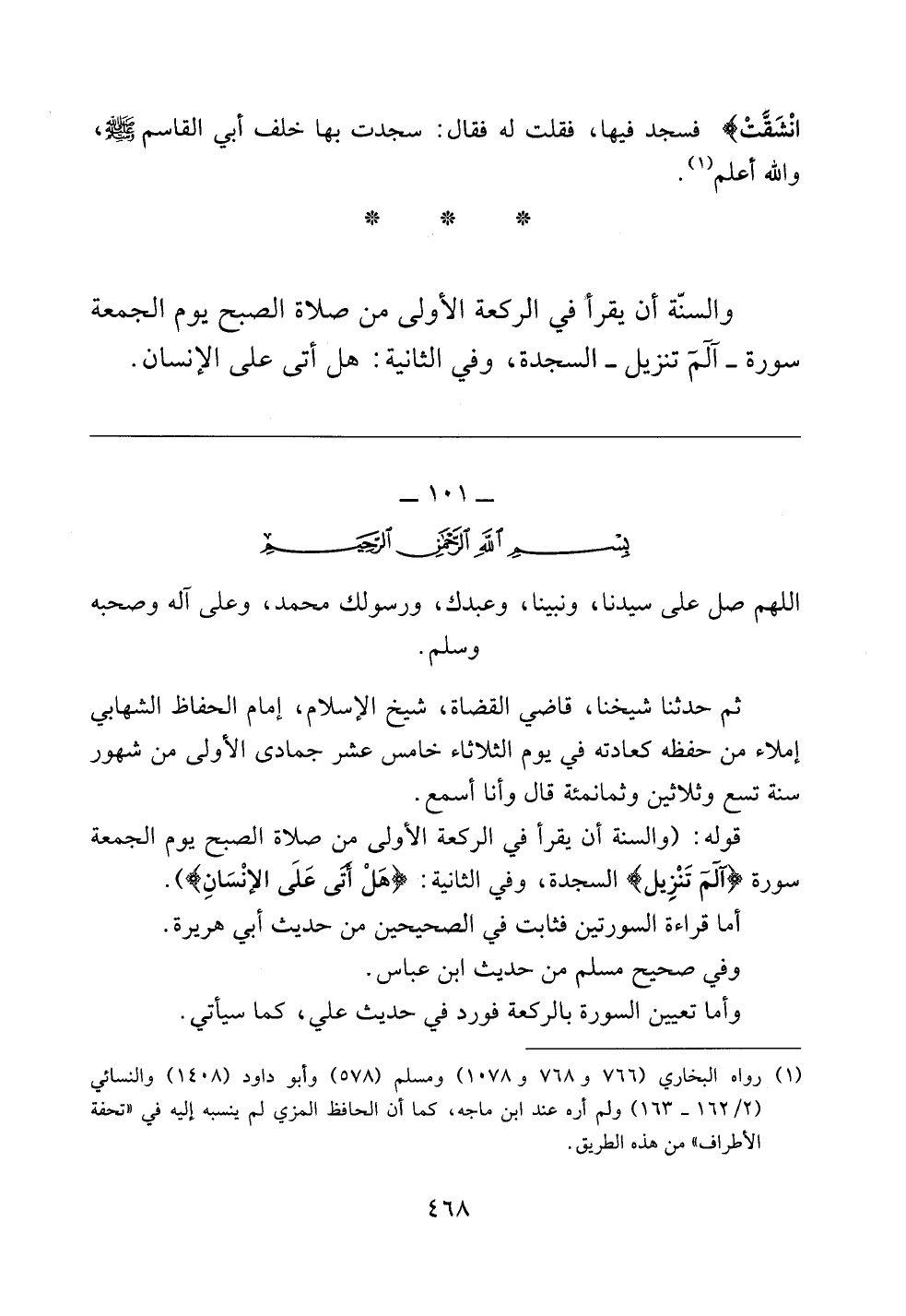 [[والسنة أن يقرأ في الركعة الأولى من صلاة الصبح يوم الجمعة سورة -آلم تنزيل- السجدة، وفي الثانية: هل أتى على الإنسان.]]