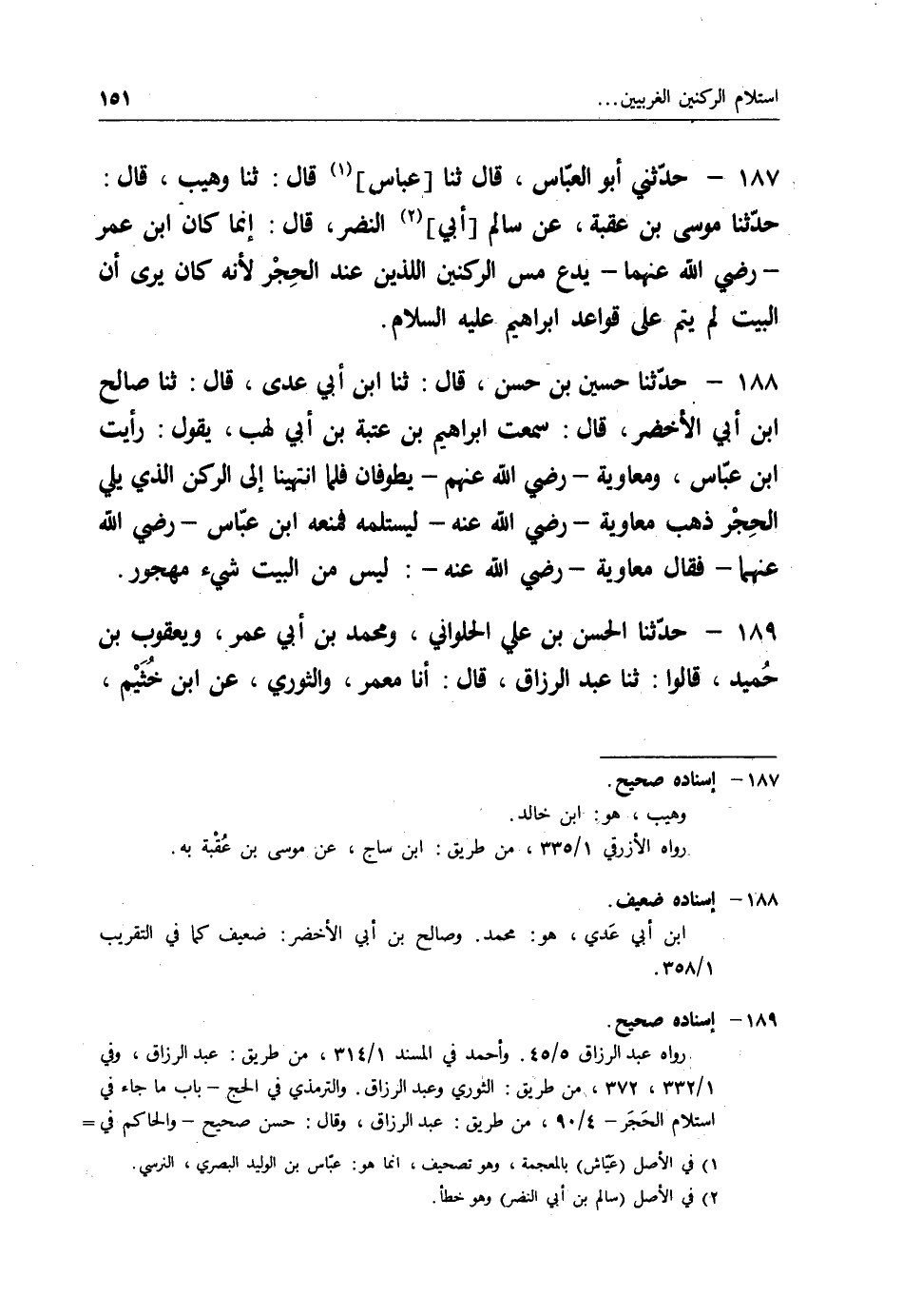 187 - حَدَّثَنِي أَبُو الْعَبَّاسِ قَالَ: ثنا عَبَّاسٌ قَالَ: ثنا وُهَيْبٌ قَالَ: حَدَّثَنَا مُوسَى بْنُ عُقْبَةَ، عَنْ سَالِمٍ أَبِي النَّضْرِ قَالَ: " إِنَّمَا كَانَ ابْنُ عُمَرَ رَضِيَ اللهُ عَنْهُمَا §يَدَعُ مَسَّ الرُّكْنَيْنِ اللَّذَيْنِ عِنْدَ الْحَجَرِ؛ لِأَنَّهُ كَانَ يَرَى أَنَّ الْبَيْتَ لَمْ يَتِمَّ عَلَى قَوَاعِدِ إِبْرَاهِيمَ عَلَيْهِ السَّلَامُ "