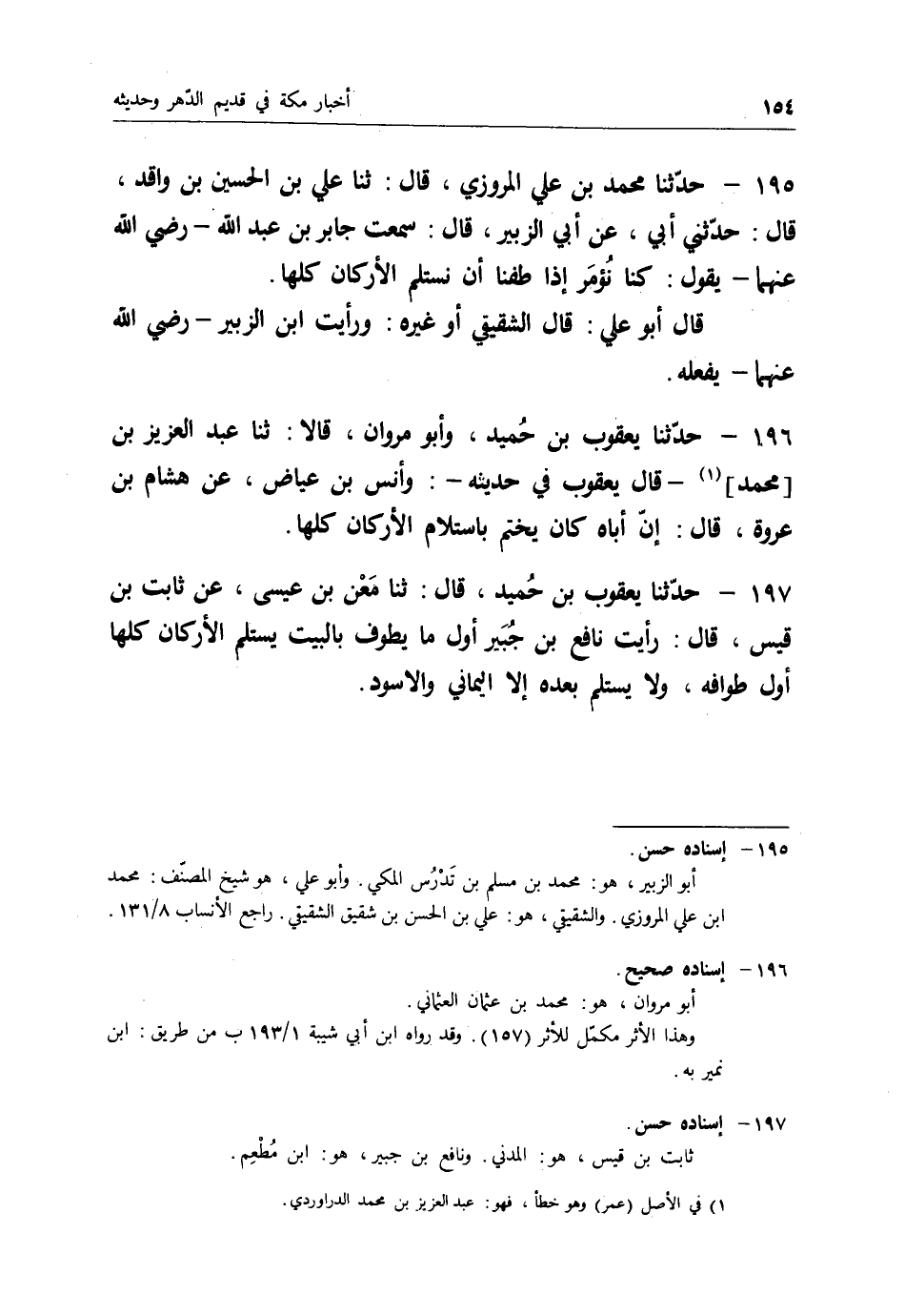195 - حَدَّثَنَا مُحَمَّدُ بْنُ عَلِيٍّ الْمَرْوَزِيُّ قَالَ: ثنا عَلِيُّ بْنُ الْحُسَيْنِ بْنِ وَاقِدٍ قَالَ: حَدَّثَنِي أَبِي، عَنْ أَبِي الزُّبَيْرِ، قَالَ سَمِعْتُ جَابِرَ بْنَ عَبْدِ اللهِ رَضِيَ اللهُ عَنْهُمَا يَقُولُ: " §كُنَّا نُؤْمَرُ إِذَا طُفْنَا أَنْ نَسْتَلِمَ الْأَرْكَانَ كُلَّهَا " قَالَ أَبُو عَلِيٍّ قَالَ الشَّقِيقِيُّ أَوْ غَيْرُهُ: وَرَأَيْتُ ابْنَ الزُّبَيْرِ رَضِيَ اللهُ عَنْهُمَا يَفْعَلُهُ