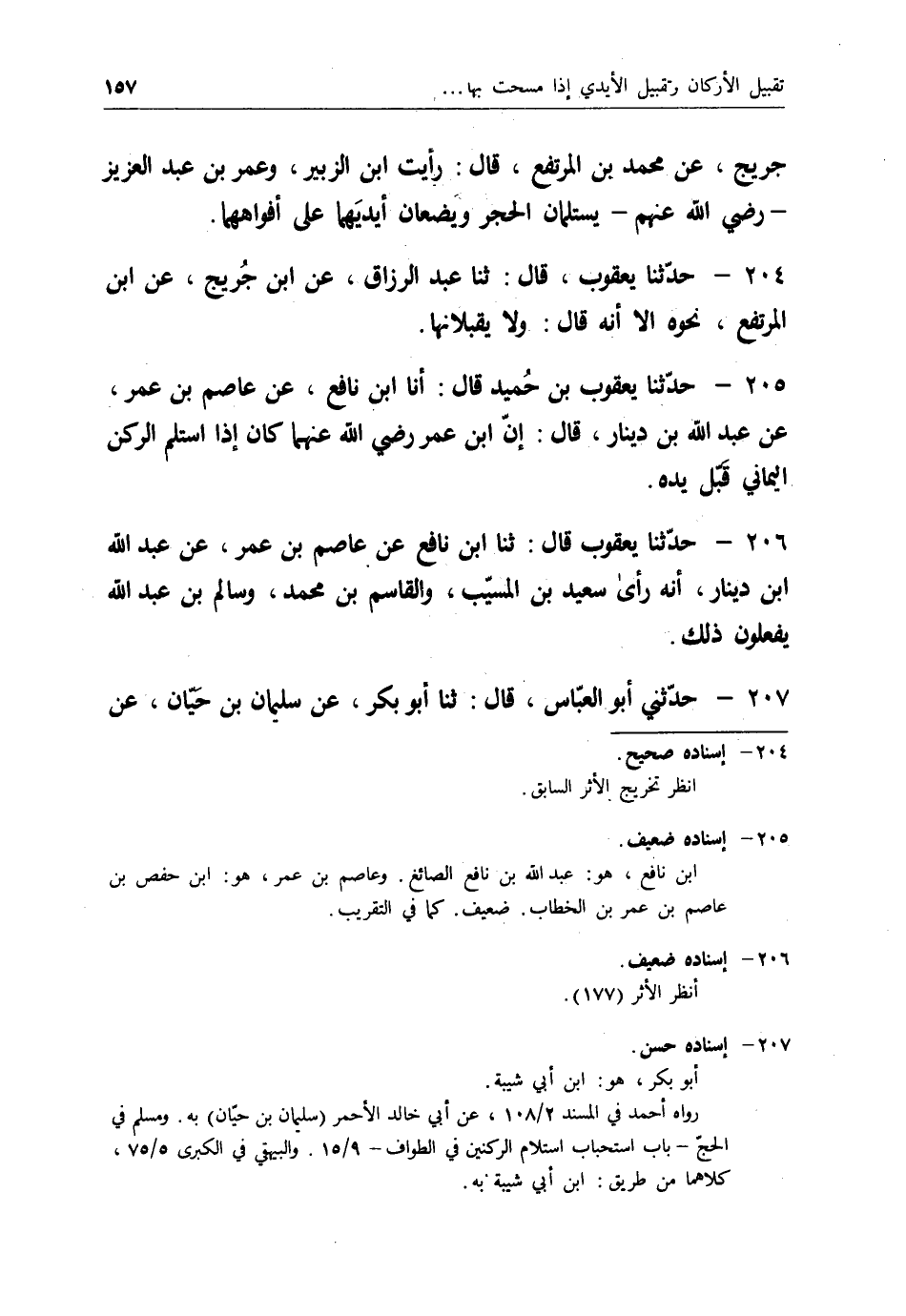 207 - حَدَّثَنِي أَبُو الْعَبَّاسِ قَالَ: ثنا أَبُو بَكْرٍ، عَنْ سُلَيْمَانَ -[158]- بْنِ حَيَّانَ، عَنْ عُبَيْدِ اللهِ بْنِ عُمَرَ، عَنْ نَافِعٍ قَالَ: رَأَيْتُ ابْنَ عُمَرَ رَضِيَ اللهُ عَنْهُمَا §اسْتَلَمَ الْحَجَرَ بِيَدِهِ فَقَبَّلَ يَدَهُ وَقَالَ: " مَا تَرَكْتُهُ مُنْذُ رَأَيْتُ رَسُولَ اللهِ صَلَّى اللَّهُ عَلَيْهِ وَسَلَّمَ يَفْعَلُهُ "