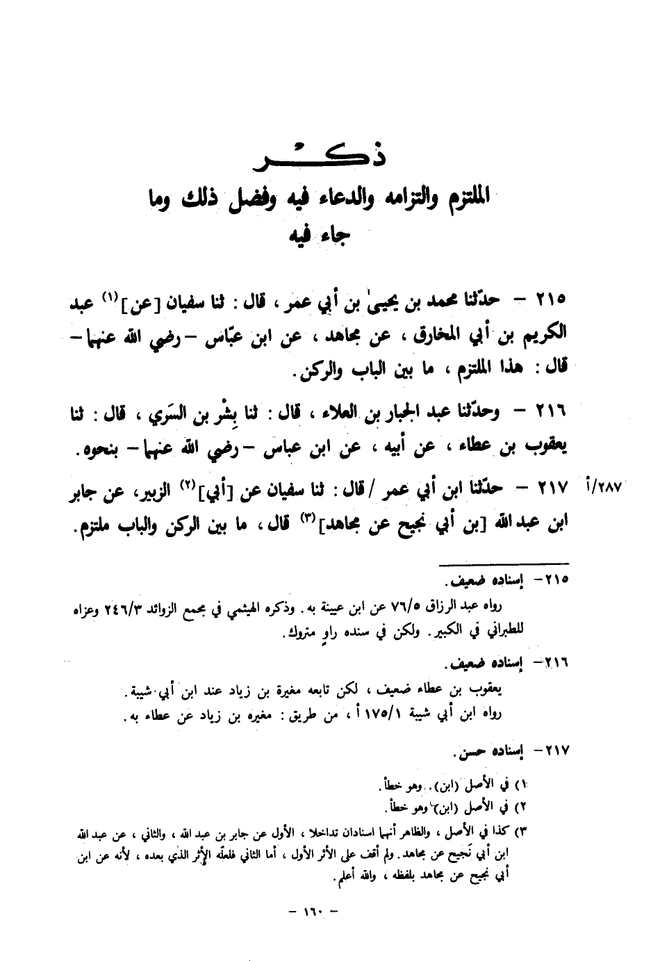 217 - حَدَّثَنَا ابْنُ أَبِي عُمَرَ قَالَ: ثنا سُفْيَانُ، عَنْ أَبِي الزُّبَيْرِ، عَنْ جَابِرِ بْنِ عَبْدِ اللهِ بْنِ أَبِي نَجِيحٍ، عَنْ مُجَاهِدٍ قَالَ: " §مَا بَيْنَ الرُّكْنِ وَالْبَابِ مُلْتَزَمٌ "