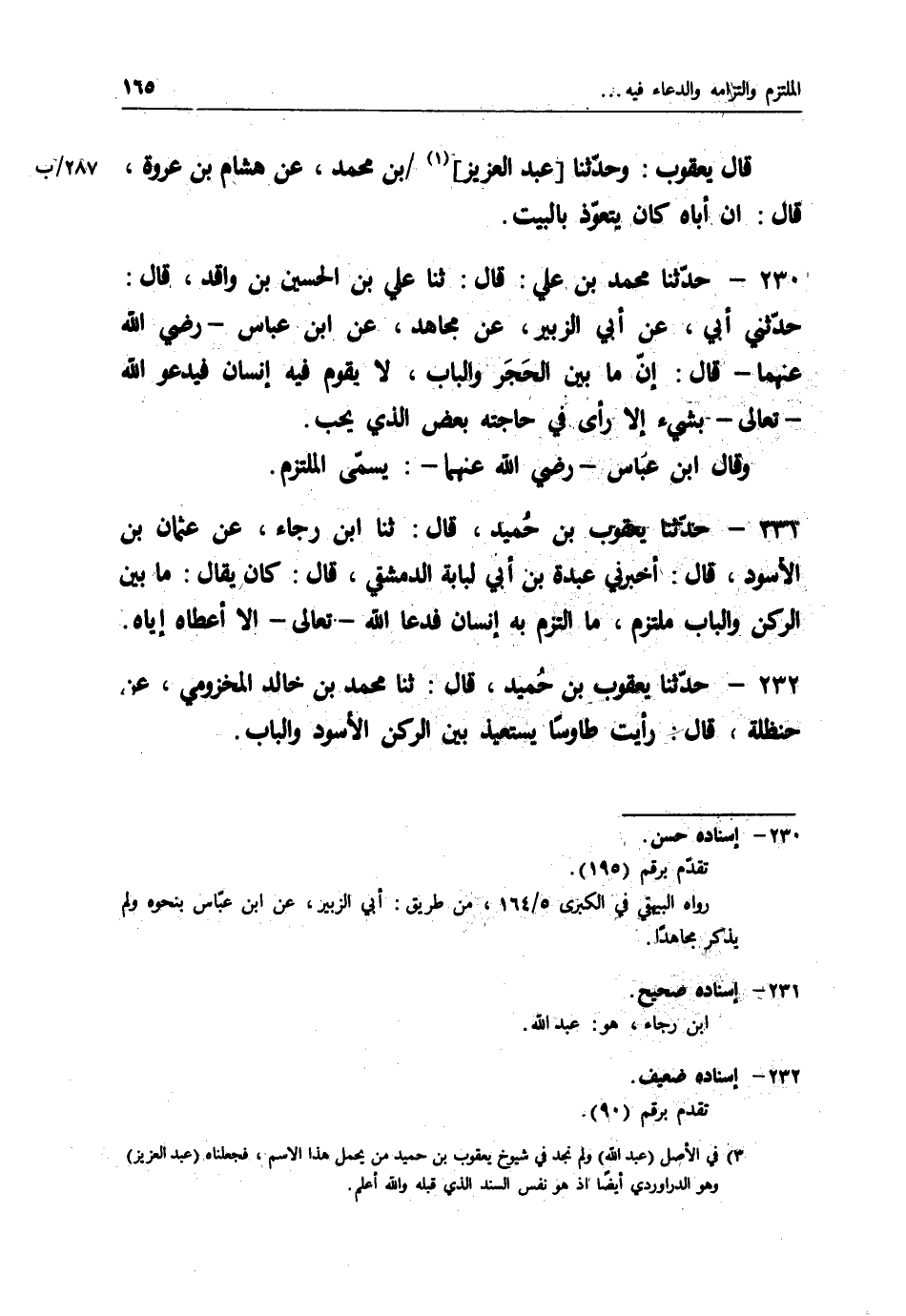 231 - حَدَّثَنَا يَعْقُوبُ بْنُ حُمَيْدٍ قَالَ: ثنا ابْنُ رَجَاءٍ، عَنْ عُثْمَانَ بْنِ الْأَسْوَدِ قَالَ: أَخْبَرَنِي عَبْدَةُ بْنُ أَبِي لُبَابَةَ الدِّمَشْقِيُّ قَالَ: " كَانَ يُقَالُ: §مَا بَيْنَ الرُّكْنِ وَالْبَابِ مُلْتَزَمٌ مَا الْتَزَمَ بِهِ إِنْسَانٌ فَدَعَا اللهَ تَعَالَى إِلَّا أَعْطَاهُ إِيَّاهُ "