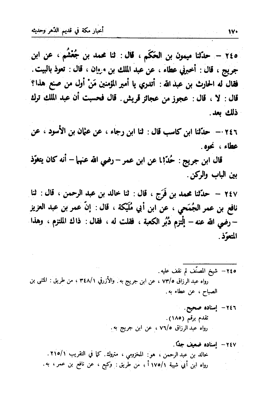 247 - حَدَّثَنَا مُحَمَّدُ بْنُ فَرَجٍ قَالَ: ثنا خَالِدُ بْنُ عَبْدِ الرَّحْمَنِ قَالَ: ثنا نَافِعُ بْنُ عُمَرَ الْجُمَحِيُّ، عَنِ ابْنِ أَبِي مُلَيْكَةَ قَالَ: إِنَّ عُمَرَ بْنَ عَبْدِ الْعَزِيزِ رَضِيَ اللهُ عَنْهُ الْتَزَمَ دُبُرَ الْكَعْبَةِ فَقُلْتُ لَهُ، فَقَالَ: " §ذَاكَ الْمُلْتَزَمُ وَهَذَا الْمُتَعَوَّذُ "