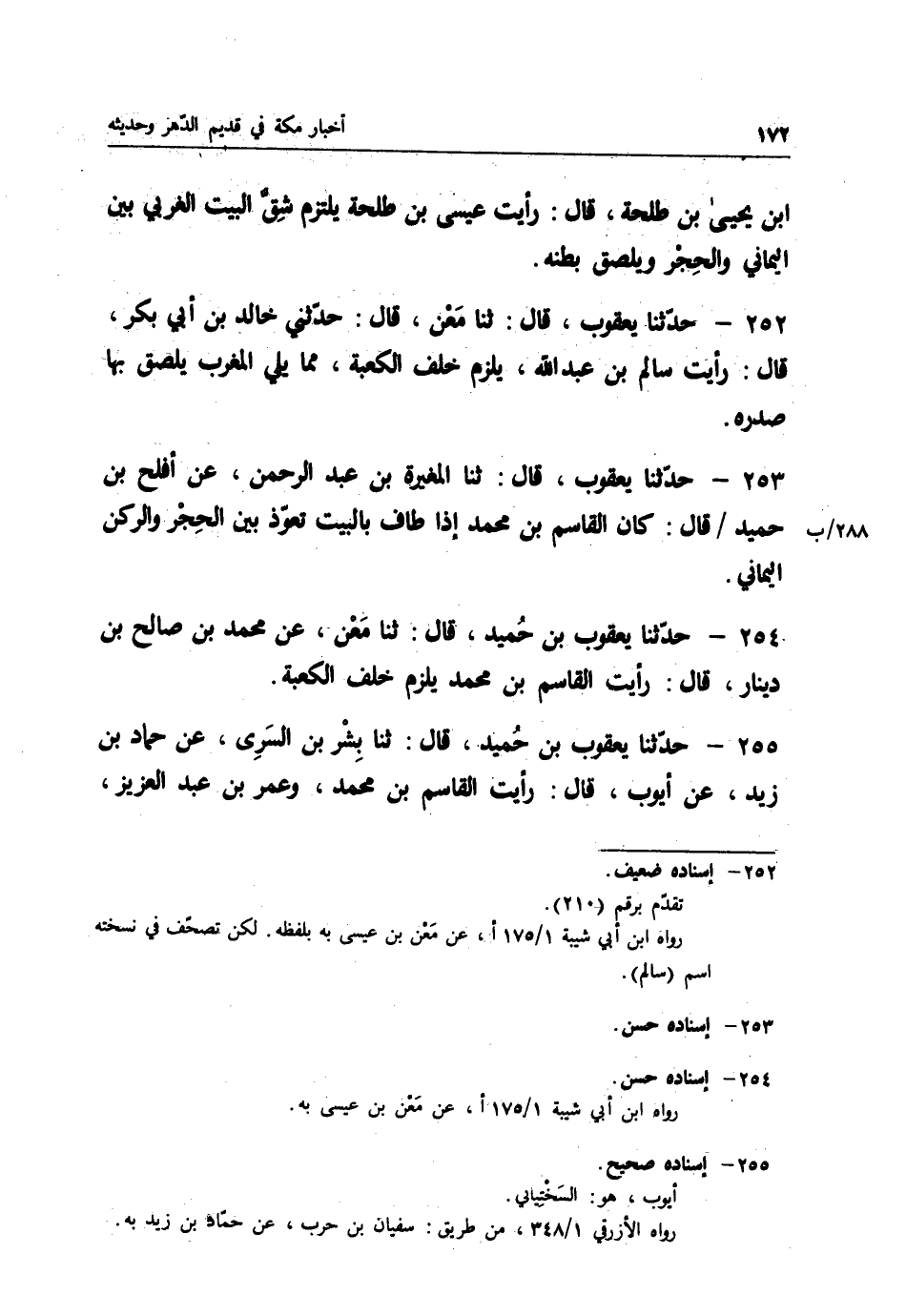 255 - حَدَّثَنَا يَعْقُوبُ بْنُ حُمَيْدٍ قَالَ: ثنا بِشْرُ بْنُ السَّرِيِّ، عَنْ حَمَّادِ بْنِ زَيْدٍ، عَنْ أَيُّوبَ قَالَ: " رَأَيْتُ الْقَاسِمَ بْنَ مُحَمَّدٍ وَعُمَرَ بْنَ عَبْدِ الْعَزِيزِ §-[173]- يَلْتَزِمَانِ حَدَّا الْبَابِ مِنْ ظَهْرِ الْكَعْبَةِ "