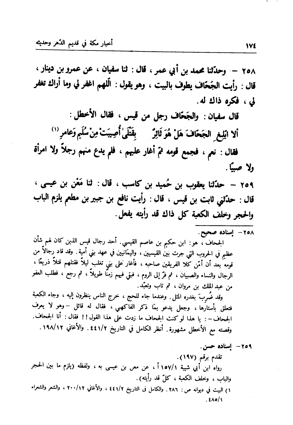 258 - وَحَدَّثَنَا مُحَمَّدُ بْنُ أَبِي عُمَرَ قَالَ: ثنا سُفْيَانُ، عَنْ عَمْرُو بْنُ دِينَارٍ قَالَ: رَأَيْتُ الْجَحَّافَ يَطُوفُ بِالْبَيْتِ وَهُوَ يَقُولُ: " §اللهُمَّ اغْفِرْ لِي، وَمَا أُرَاكَ تَغْفِرُ لِي، فَكَرِهَ ذَاكَ لَهُ " قَالَ سُفْيَانُ: وَالْجَحَّافُ رَجُلٌ مِنْ قَيْسٍ فَقَالَ الْأَخْطَلُ: