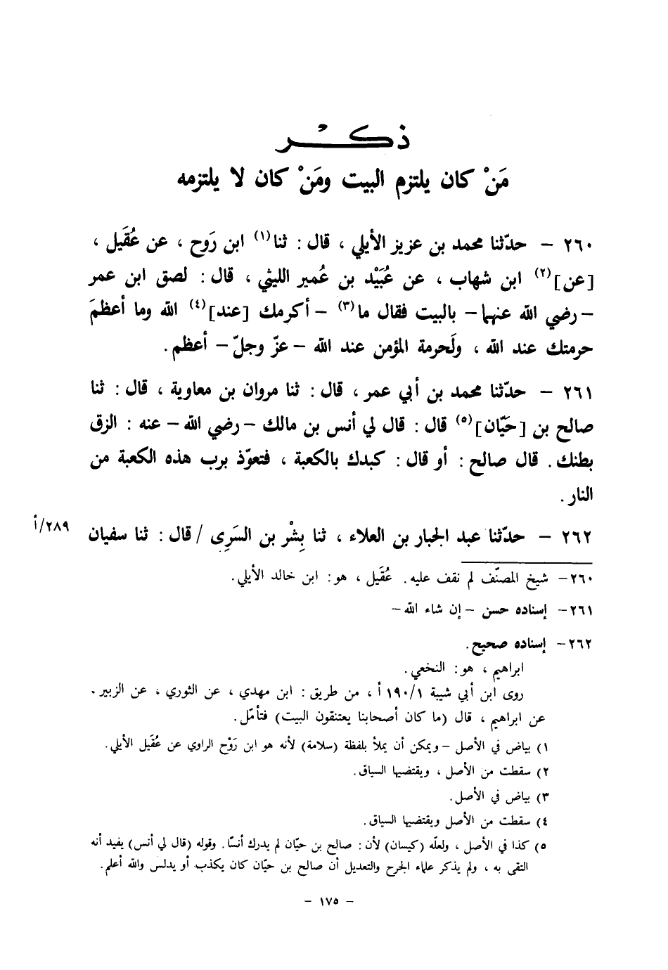 262 - حَدَّثَنَا عَبْدُ الْجَبَّارِ بْنُ الْعَلَاءِ، ثنا بِشْرُ بْنُ السَّرِيِّ -[176]- قَالَ: ثنا سُفْيَانُ الثَّوْرِيُّ، عَنِ الزُّبَيْرِ بْنِ عَدِيٍّ، عَنْ إِبْرَاهِيمَ قَالَ: " §كَانَ أَصْحَابُنَا يَعْتَنِقُونَ الْبَيْتَ "