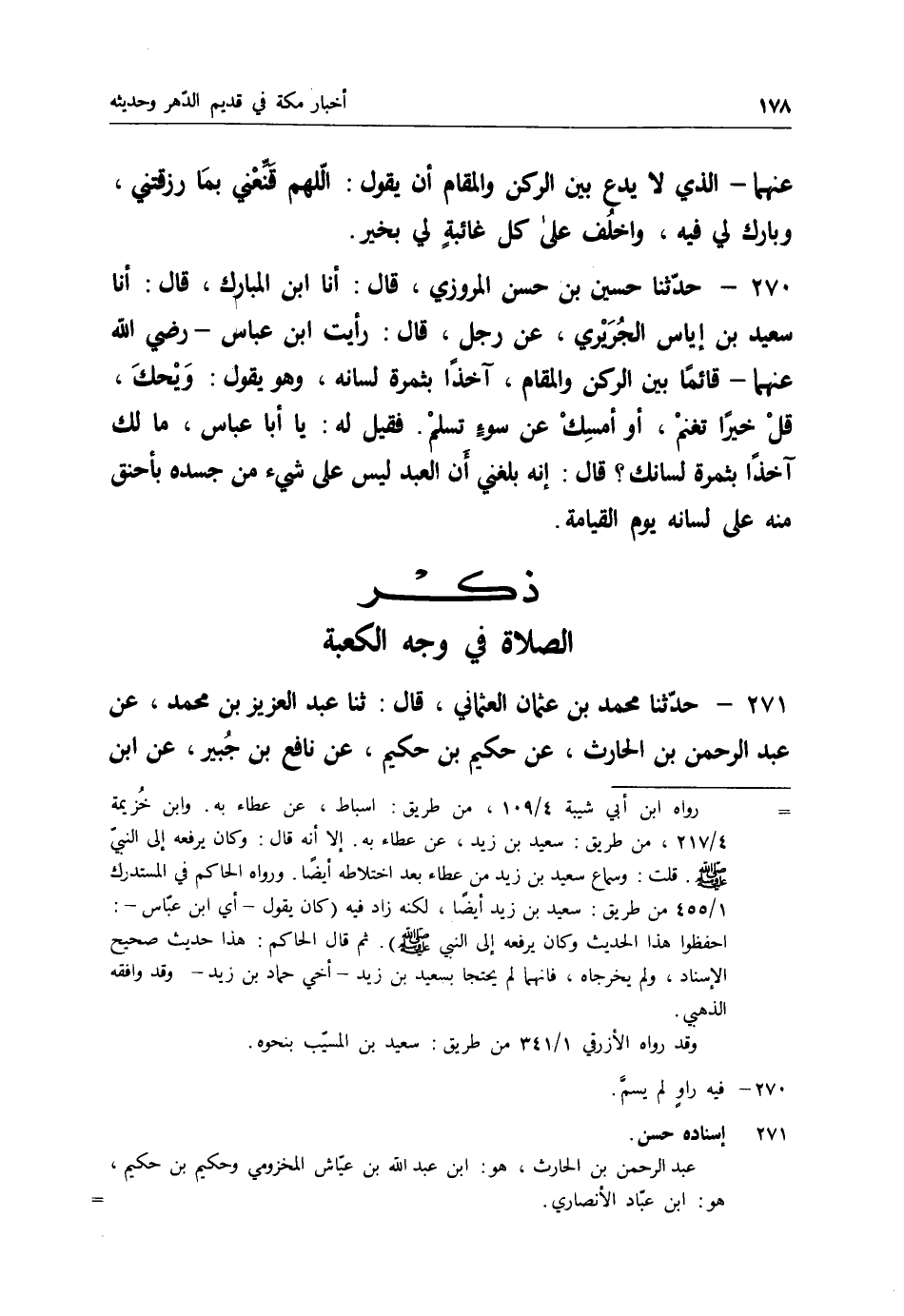 271 - حَدَّثَنَا مُحَمَّدُ بْنُ عُثْمَانَ الْعُثْمَانِيُّ قَالَ: ثنا عَبْدُ الْعَزِيزِ بْنُ مُحَمَّدٍ، عَنْ عَبْدِ الرَّحْمَنِ بْنِ الْحَارِثِ، عَنْ حَكِيمِ بْنِ حَكِيمٍ، عَنْ نَافِعِ بْنِ جُبَيْرٍ، عَنِ ابْنِ -[179]- عَبَّاسٍ رَضِيَ اللهُ عَنْهُمَا قَالَ: إِنَّ رَسُولَ اللهِ صَلَّى اللَّهُ عَلَيْهِ وَسَلَّمَ قَالَ: " §أَمَّنِي جِبْرِيلُ عَلَيْهِ الصَّلَاةُ وَالسَّلَامُ عِنْدَ بَابِ الْكَعْبَةِ مَرَّتَيْنِ "