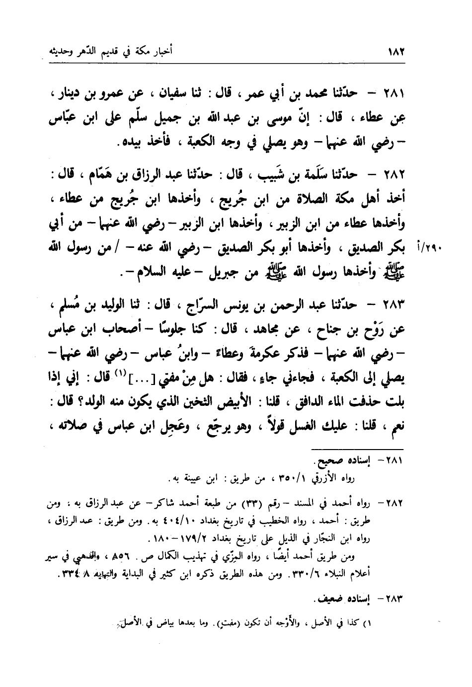 282 - حَدَّثَنَا سَلَمَةُ بْنُ شَبِيبٍ قَالَ: حَدَّثَنَا عَبْدُ الرَّزَّاقِ بْنِ هَمَّامٍ قَالَ: " §أَخَذَ أَهْلُ مَكَّةَ الصَّلَاةَ مِنِ ابْنِ جُرَيْجٍ، وَأَخَذَهَا ابْنُ جُرَيْجٍ مِنْ عَطَاءٍ، وَأَخَذَهَا عَطَاءٌ مِنِ ابْنِ الزُّبَيْرِ، وَأَخَذَهَا ابْنُ الزُّبَيْرِ رَضِيَ اللهُ عَنْهُمَا مِنْ أَبِي بَكْرٍ الصِّدِّيقِ، وَأَخَذَهَا أَبُو بَكْرٍ الصِّدِّيقُ رَضِيَ اللهُ عَنْهُ مِنْ رَسُولِ اللهِ صَلَّى اللَّهُ عَلَيْهِ وَسَلَّمَ، وَأَخَذَهَا رَسُولُ اللهِ صَلَّى اللَّهُ عَلَيْهِ وَسَلَّمَ مِنْ جِبْرِيلَ عَلَيْهِ السَّلَامُ "
