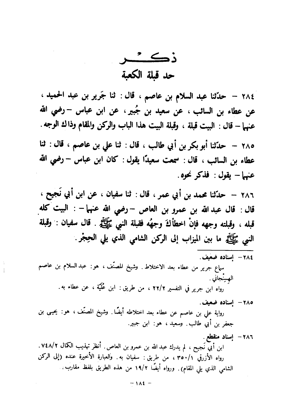 286 - حَدَّثَنَا مُحَمَّدُ بْنُ أَبِي عُمَرَ قَالَ: ثنا سُفْيَانُ، عَنِ ابْنِ أَبِي نَجِيحٍ قَالَ: قَالَ عَبْدُ اللهِ بْنُ عَمْرِو بْنِ الْعَاصِ رَضِيَ اللهُ عَنْهُمَا: " §الْبَيْتُ كُلُّهُ قِبْلَةٌ، وَقِبْلَتُهُ وَجْهُهُ، فَإِنْ أَخْطَأَكَ وَجْهُهُ فَقِبْلَةُ النَّبِيِّ صَلَّى اللَّهُ عَلَيْهِ وَسَلَّمَ " قَالَ سُفْيَانُ: " وَقِبْلَةُ النَّبِيِّ صَلَّى اللَّهُ عَلَيْهِ وَسَلَّمَ مَا بَيْنَ الْمِيزَابِ إِلَى الرُّكْنِ الشَّامِيِّ الَّذِي يَلِي الْحِجْرَ "