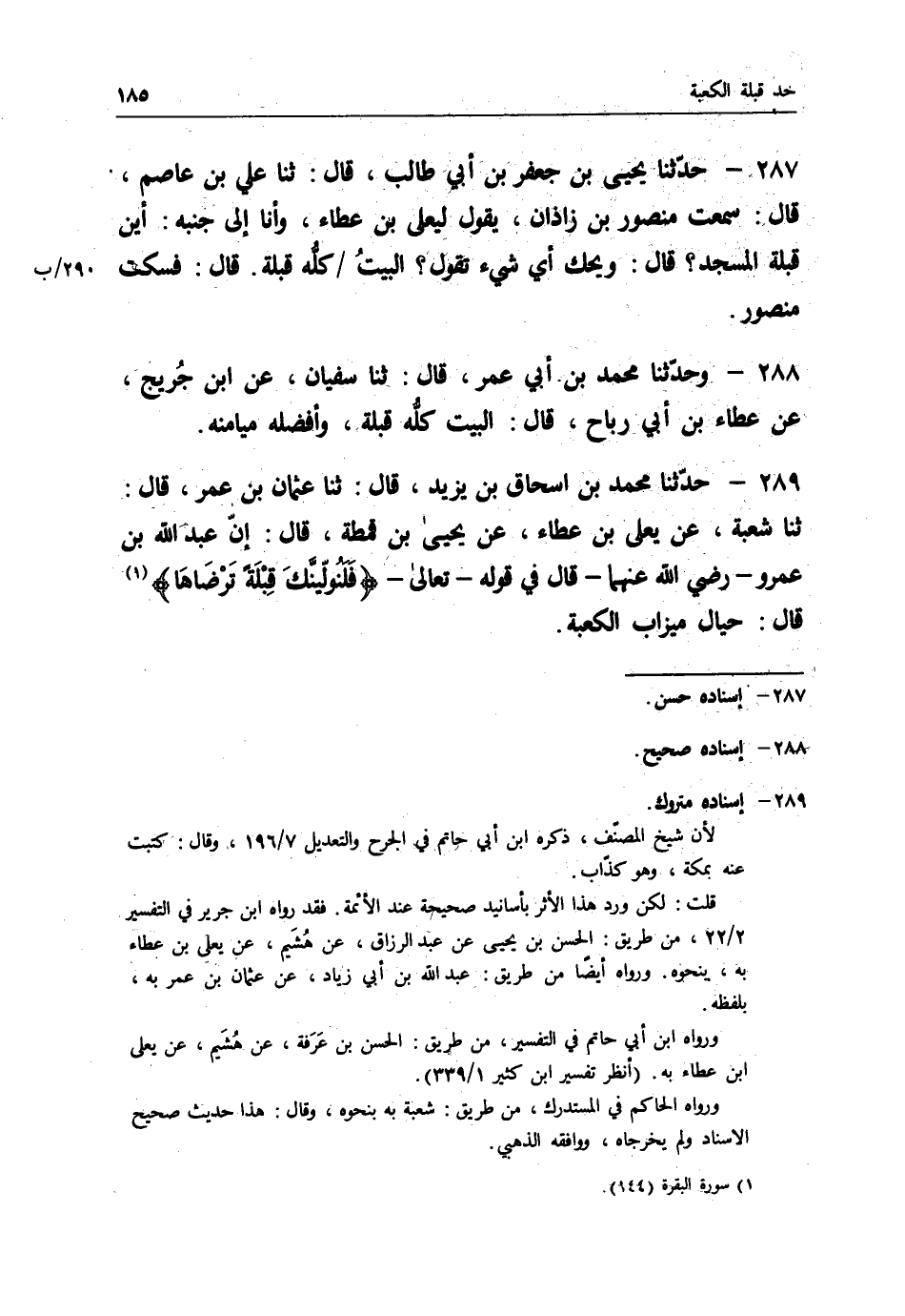 289 - حَدَّثَنَا مُحَمَّدُ بْنُ إِسْحَاقَ بْنِ يَزِيدَ قَالَ: ثنا عُثْمَانُ بْنُ عُمَرَ قَالَ: ثنا شُعْبَةُ، عَنْ يَعْلَى بْنِ عَطَاءٍ، عَنْ يَحْيَى بْنِ قَمْطَةَ قَالَ: إِنَّ عَبْدَ اللهِ بْنِ عَمْرٍو رَضِيَ اللهُ عَنْهُمَا قَالَ: فِي قَوْلِهِ تَعَالَى: {§فَلَنُوَلِّيَنَّكَ قِبْلَةً تَرْضَاهَا} [البقرة: 144] قَالَ: " حِيَالَ مِيزَابِ الْكَعْبَةِ "